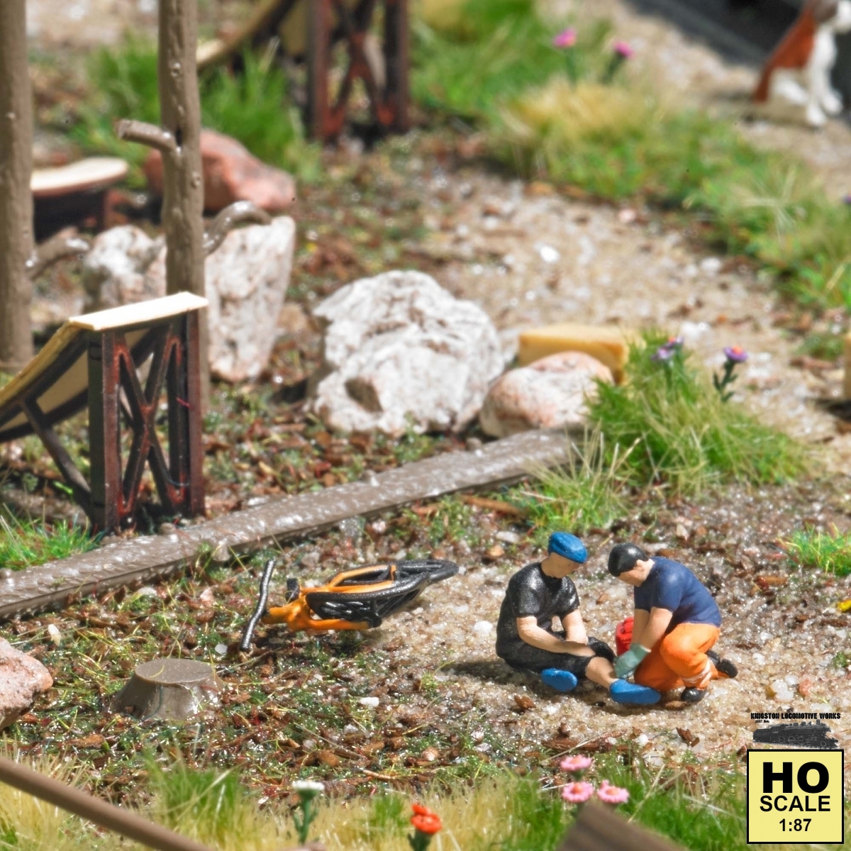 Busch Action Sets are easy to add on any H0 scale model railroad layout, diorama or display. The scenes are created according to special themes. Each set includes a mix of accessories and at least one appropriate, painted figure. There is an accident on the bike trail! The emergency services arrive quickly on the scene and help the casualty back on his feet. Set with injured biker, paramedic and damaged mountain bike. For further scenery details also included are a ramp, 3 spruce trees, tree trunk, root, roofed information board, wooden barrier and 2 litter bins. *** Photos may show additional scenery, structures, figures, vehicles, tools, etc which are not included. Please ask before ordering if you're unsure what's included. Most structures are kits which require assembly. *** UPC: 4001738798258