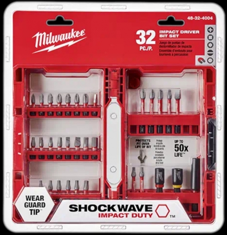 SHOCKWAVE™ Impact Duty Driver Bit Set - 32PC Our 32 Piece SHOCKWAVE™ Impact Driver Bit Set is engineered to be the Most Durable, best Fitting Driver Bits on the market. Each impact driver bit features Milwaukee Wear Guard Tip™ that delivers increased wear resistance which protects the fit over the life of the bit. The driver bits in this MILWAUKEE® SHOCKWAVE™ bit set has optimized Shockzones for each tip type and length of the driver bit to absorb peak torque and prevent breaking. The impact driver bits are made from Custom Alloy76™ steel, heat treated based on tip type to extend the life of driver bits, providing you with up to 50X life vs. competitive impact driver bits. Milwaukee SHOCKWAVE™ driver bits are built to deliver extreme durability for the most demanding jobsite applications. Includes: (1) TORX® Bit 2" T25 (1) TORX® Bit 2" T20 (1) TORX® Bit 1" T30 (2) TORX® Bit 1" T25 (2) TORX® Bit 1" T20 (1) TORX® Bit 1" T15 (1) Square Bit 2" SQ2 (1) Square Bit 1" SQ3 (3) Square Bit 1" SQ2 (1) Square Bit 1" SQ1 (1) Slotted 2" #10 Bit (1) Slotted 1" #8 Bit (1) Slotted 1" #10 Bit (1) SHOCKWAVE™ Magnetic Bit Holder (1) Phillips Reduced 1" PR2 Bit (2) Phillips Bit 2" P2 (1) Phillips Bit 1" P3 (4) Phillips Bit 1" P2 (1) Phillips Bit 1" P1 (1) Hex Bit 1" 3/16" (1) Hex Bit 1" 1/4" (1) 5/16" Magnetic Nut Driver (1) 1/4" Magnetic Nut Driver UPC: 0045242349562