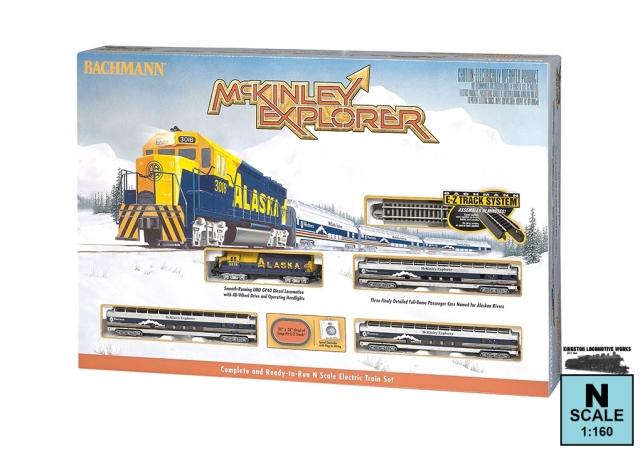 Treating passengers to breathtaking views of the Alaskan wilderness in special vista-dome cars is the McKinley Explorer. Operating today from Anchorage to Fairbanks, and running past Denali National Park, this train's lucky riders might thrill to the sight of bear, moose, sheep and bald eagles. Now updated with a GP40 diesel, our N scale McKinley Explorer set comes complete with: EMD GP40 locomotive with operating headlight three full-dome passenger cars (the Kenai, Knik and Deshka, all named after Alaskan rivers) 34" x 24" oval of nickel silver E-Z Track® including 11 pieces curved track, 4 pieces straight track, and 1 curved plug-in terminal rerailer power pack and speed controller illustrated instruction manual |