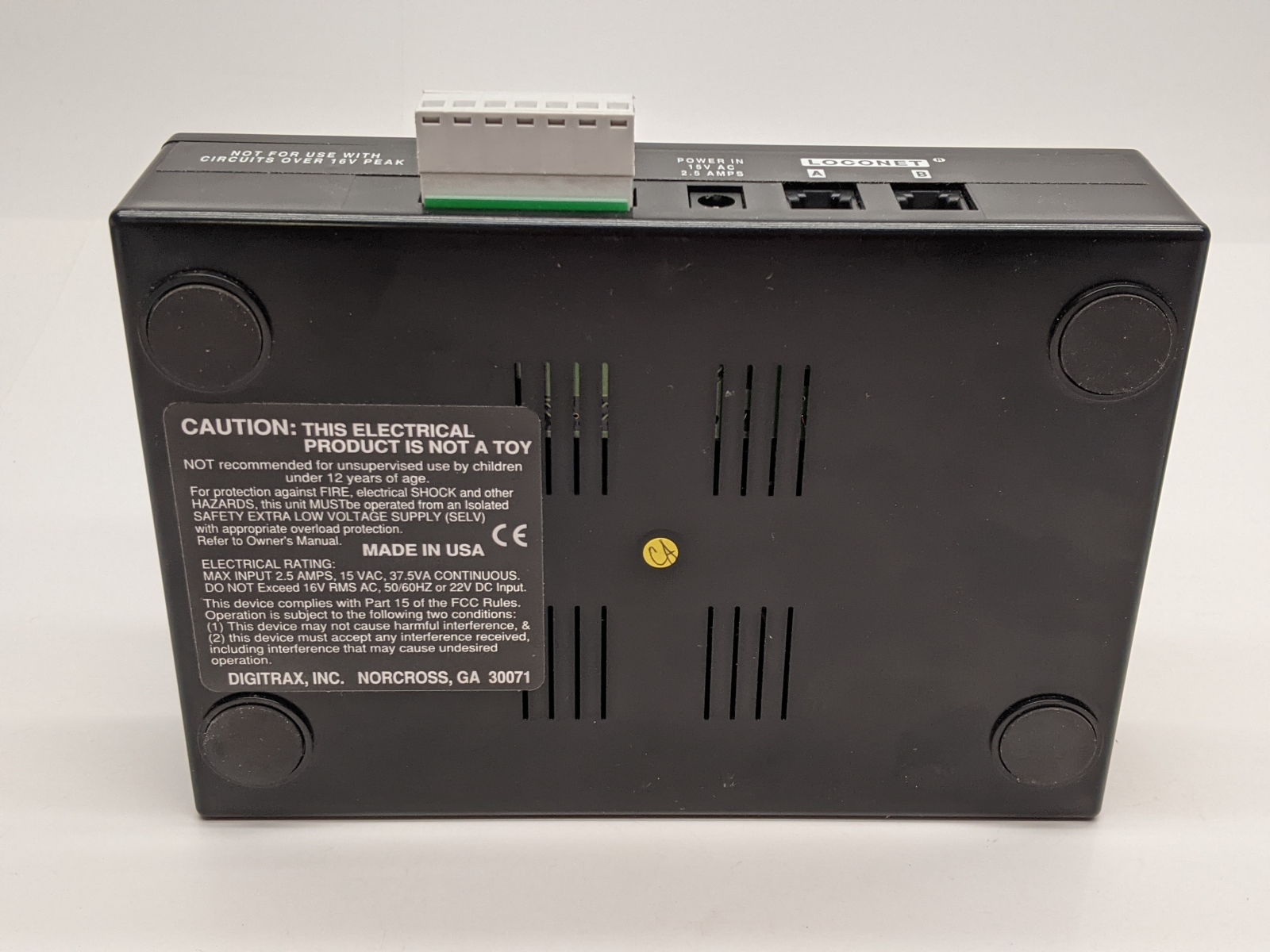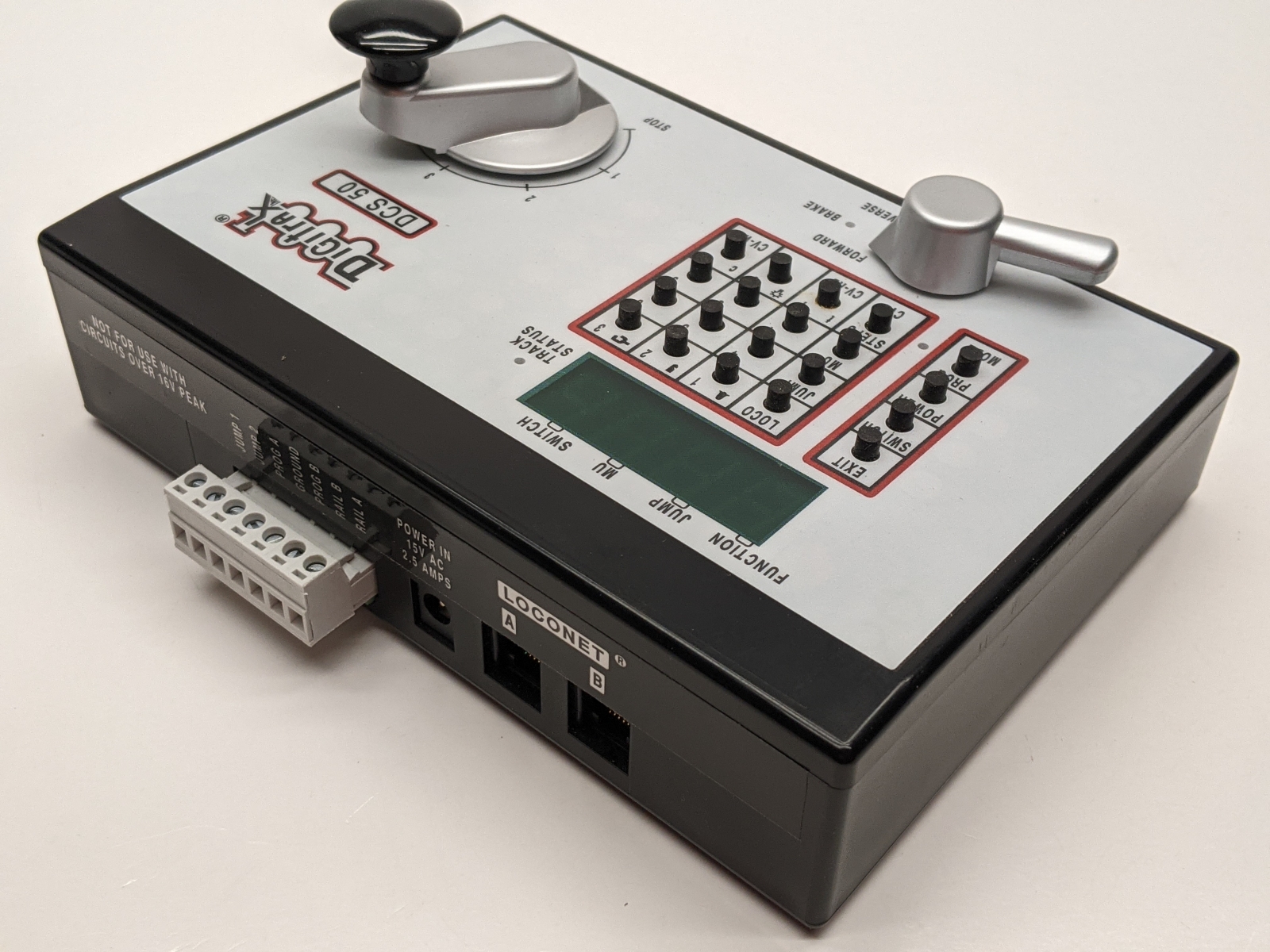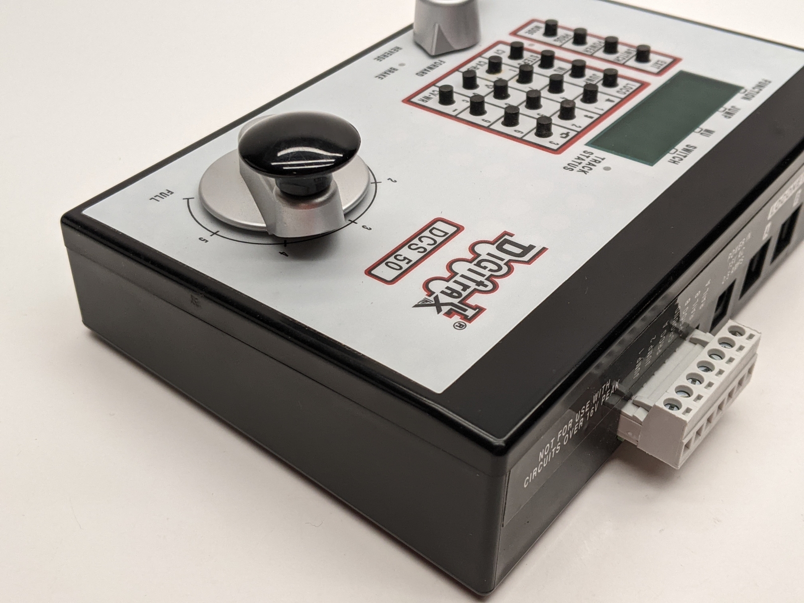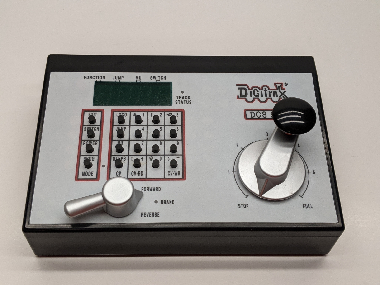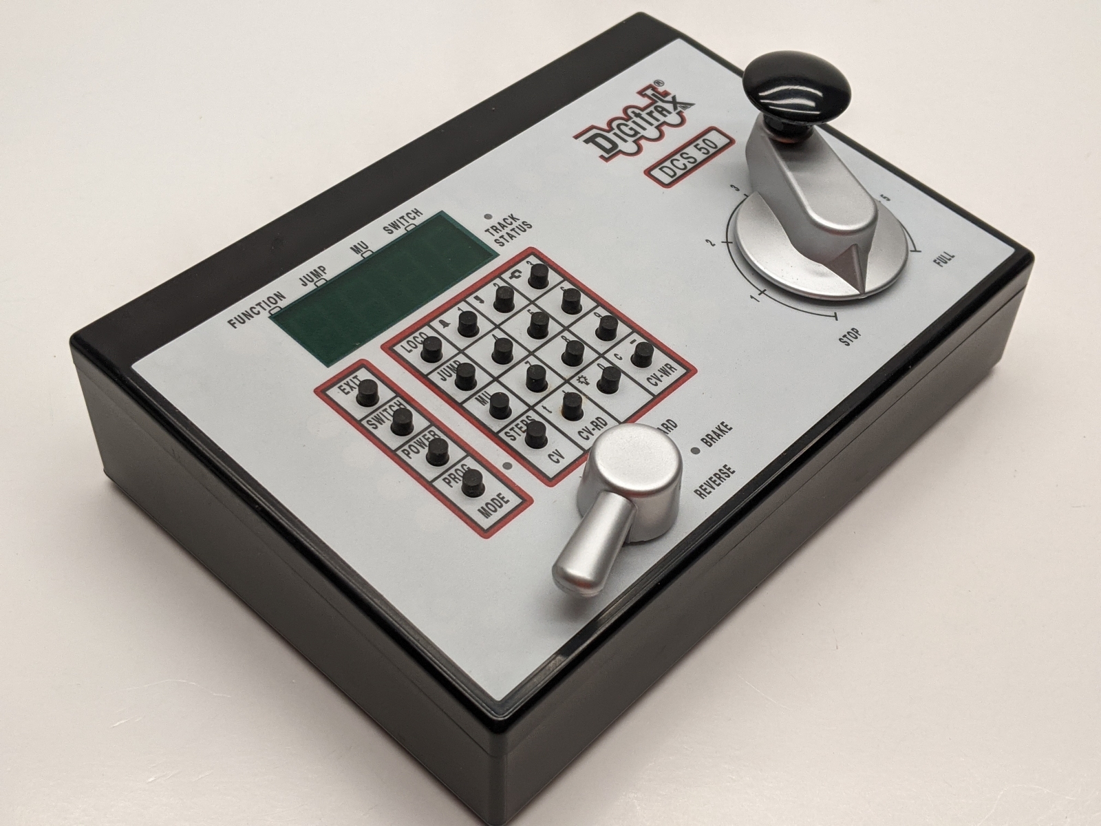 Local downsizing consignment. DCS50 Features: Simple to use controls for running trains. Large speed control knob and direction switch with brake. Full numeric key pad. Easy 2 and 4 digit addressing. Smooth speed control. Run multiple trains at once without blocking! Run up to 10 addresses at the same time on your system. Run up to 10 throttles at the same time on your system. Jump Ports for using DC power packs as additional throttles Use one or two smooth DC power packs as throttles to control DCC equipped locomotives. Simple, cost effective way to add more throttles to your Zephyr set. Makes it easy to share the fun of DCC with layout visitors and young operators. Functions on locos controlled by Jump throttles remain active. Over 9000 Locomotive Addresses Use Address 00 to run one or more locos without DCC decoders Two Digit Addressing is easy to use. (Address 01-127) Four Digit Addressing-use the number painted on your engines as its address. 2.5 Amps of Power to run multiple trains. Booster outputs 12V for safe operation in N and HO scales. Function Control Control 10 functions-F0 through F8. Function 2 is a special non-latching key that can be used to sound the horn for as long as the key is held down. Constant brightness lighting. Headlights can be directional or independently controlled (depending on decoder). Stationary Decoders, Turnout Control & Turnout Position Reporting Access to stationary decoder control for turnouts and other devices. Control 999 stationary decoder addresses. Consisting Universal consisting, Digitrax preferred method. ALL locos can be consisted, even analog locos. Advanced consisting, allows only advanced consist capable mobile decoders. Basic consisting, program decoders to run on same address. Decoder Programming Built in read/write programmer that can read and write all CVs. Supports Paged programming (Digitrax preferred method). Also supports direct & register mode programming. Operations mode programming can be used to program decoders on the layout. Expandability with Digitrax LocoNet Use Zephyr as a starting point for your Digitrax LocoNet System, then add components. Use Zephyr as an expansion set with Digitrax equipment you already have installed. Add Radio or IR via LocoNet. Just plug in a UR90 or UR91 receiver and add IR and/or Radio throttles. |