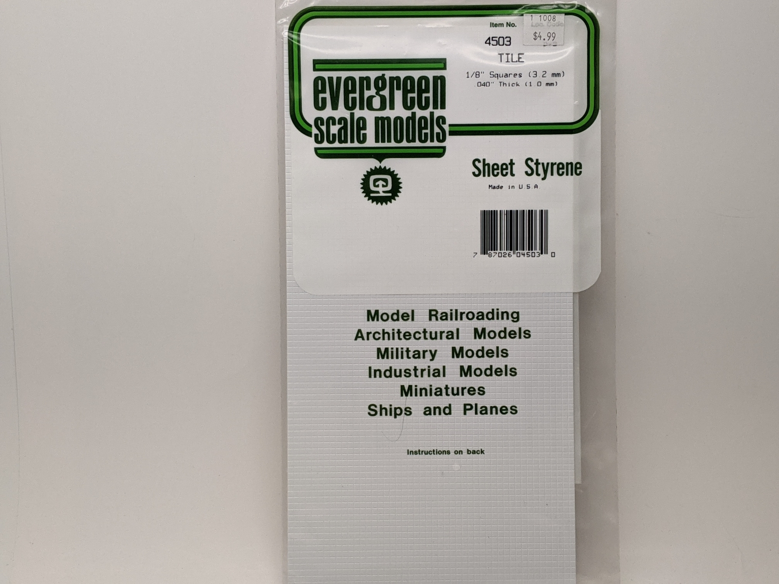 Evergreen 4503 Tile 1/8" / 3.2mm Squares 0.040"/1.0mm Thick 6x12" White Sheet Styrene 1pc Manufacturer: Evergreen Scale Models (Made in USA)