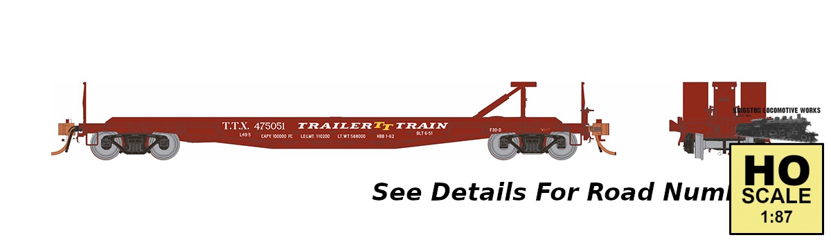 Rapido’s new model features: Die-cast chassis and deck for optimum weight Correct trucks (PRR 2E-F10, roller bearing converted or full roller bearing trucks) Turned metal wheels Full brake rigging Separate grab irons Correct piggy-back details (Class F30D & G) Equipped with Rapido's own *NEW* semi-scale couplers The Pennsylvania Railroad’s class F30A flat cars were one of the most numerous classes of flat cars on that railroad with 1500 being built between 1933 and 1934. The PRR utilized a massive one-piece steel casting on these cars, and that sturdy construction meant that many lasted an incredibly ling time. The cars were so successful that the PRR built another 250 nearly identical copies in 1951, classified as F30D. Starting in 1954 the Pennsy converted many F30D flat cars into early piggyback service cars. These cars received perforated side rub rails, end loading ramps and four side posts. Eighty-six cars were transferred to the new Trailer Train Company (TTX) between 1957 and 1958. These cars received additional upgrades in the form of ACF trailer hitches and revised side rails and upgraded end ramps. The TTX cars also received roller bearing conversions on their trucks. Classified as F30G, these cars were used by TTX into the 1980s, many being upgraded with full roller bearing trucks and many even painted in TTX’s yellow scheme. UPC: 0679164068326