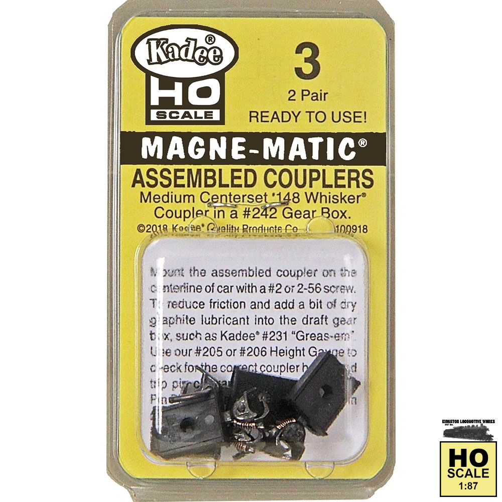 Kadee 3 HO Assembled #148 Whisker® Metal Couplers - Medium (9/32") Centerset (Two Pair) Manufacturer: Kadee (Made in USA)