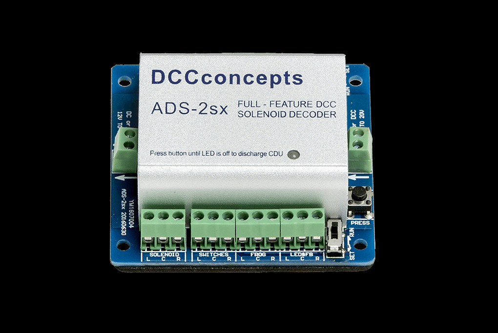 Accessory Decoder CDU Solenoid Drive SX 2-Way with Power-Off Memory and Protective Case ADS-2sx is an easy-to-use 2-way accessory decoder for solenoids with power-off memory. ADS-2sx has a CDU built-in to each output and is the most reliable and most powerful solenoid decoder available, yet it stores all its power on-board so does not drain your DCC track power! Packed with features including a CDU discharge button, Panel LED or Signal Control, Push-Button Option and Frog Power Switching. Size Width 64mm Depth 64mm Height 22mm Also available in 4 and 8 way variants UPC: 9347394000829