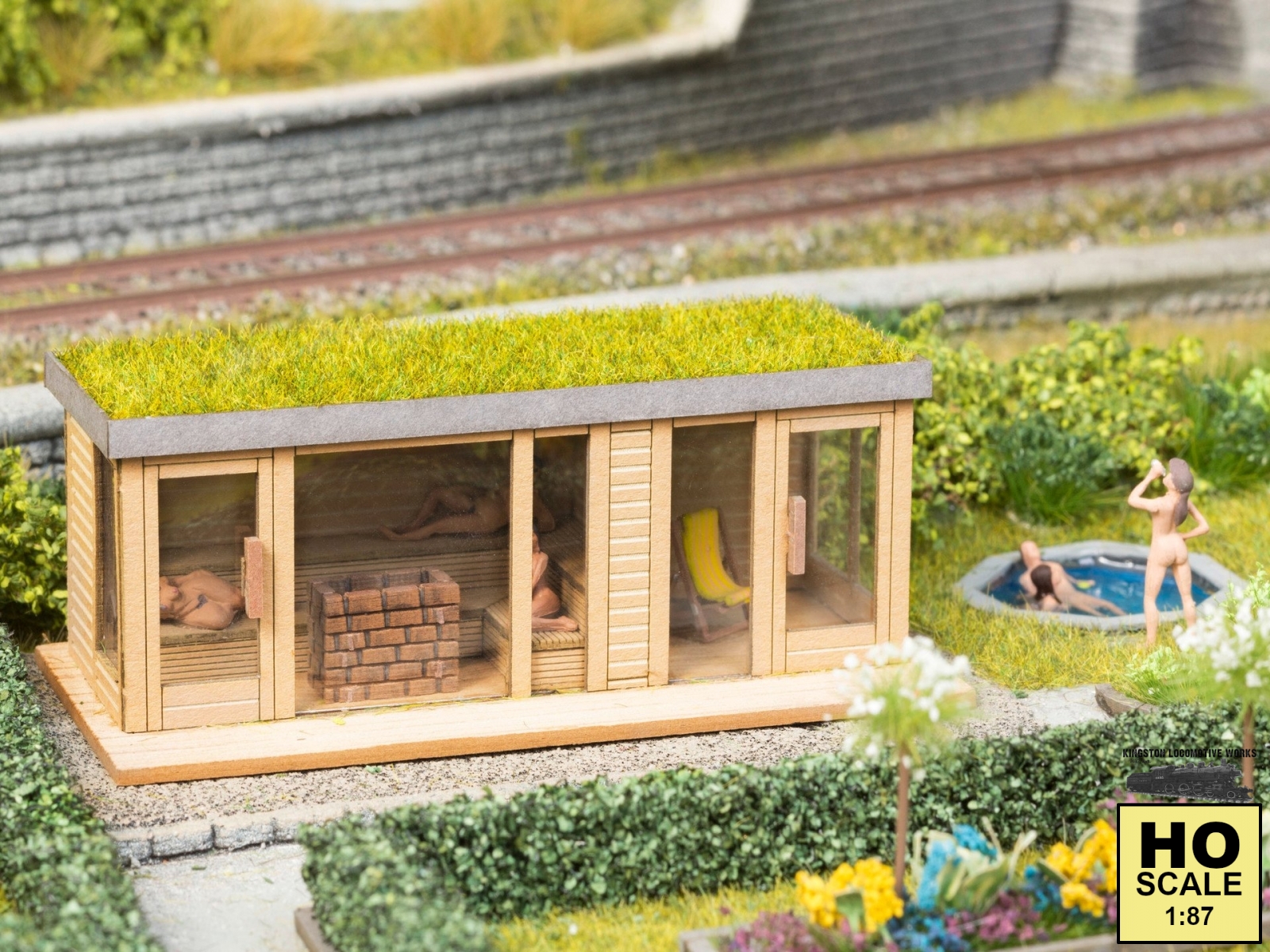 Pure Relaxation in Your Own Garden The NOCH “Sauna with a View” is ideally suited to high-quality design for every model landscape. Many people go to the sauna in order to properly switch off from everyday stress. Of course, it’s great when you also have your own sauna in the garden and can use the sauna at any time. The building consists of a relaxation room and the actual sauna with the typical heater. However, there are separate entrances. Various infusions can be made, such as aroma infusions, honey or salt infusions. The steam bath in the sauna promotes health and is used for relaxation. You could get to like this place, as it allows you to totally switch off together with friends or your partner. Bring this relaxed and idyllic scene to your model layout and put it even more in the spotlight. So that those in the model railway hobby don’t get a raw deal when it comes to realism, the kit made of high-quality laser cardboard is available for an affordable price in the NOCH online shop. The little, fine things in life! NOCH Laser-Cut minis have by now become an institution. We are constantly expanding our range with new Laser-Cut minis for H0, TT and N gauge. The kits are available for a low price, and they are sure to find a place on every model railway layout. They also liven up the scenery. Just let yourself be inspired by our wide variety of topics! The little things make life special and that’s exactly how it is in a model landscape, too! *** Photos may show additional scenery, structures, figures, vehicles, tools, etc which are not included. Please ask before ordering if you're unsure what's included. *** Width: 43 mm Height: 35 mm Length: 89 mm Gauge: H0 Product Notices: Laser cut UPC: 4007246143979