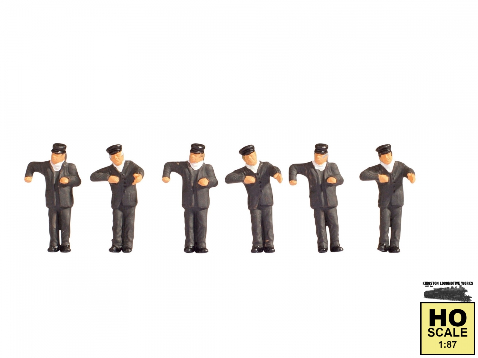 Engine Drivers for Steam Locomotives The Engine Drivers are wearing the black uniforms and black caps typical of the time. Since work on the so-called ‘iron horses’ was very dusty and sooty, practical black work clothes were provided. The Engine Drivers are standing in typical poses and they can be used in pairs. One engine driver stands on the right in the driver’s cab, rests his arm on the window and looks out. The engine driver on the left operates the controls. Unmanned locomotives on model railway layouts are unattractive and unrealistic. Steam locomotives can be decorated realistically with the Engine Drivers. The set contains six handpainted plastic figures for H0 gauge (1:87 scale, approx. 2 cm high). *** Photos may show additional scenery, structures, figures, vehicles, tools, etc which are not included. Please ask before ordering if you're unsure what's included. *** Gauge: H0 Scale: 1:87 (H0) Product Notices: Hand colored Genus: Human Material: Plastic Position: standing Gender: male Phase of life: Adult UPC: 4007246152810