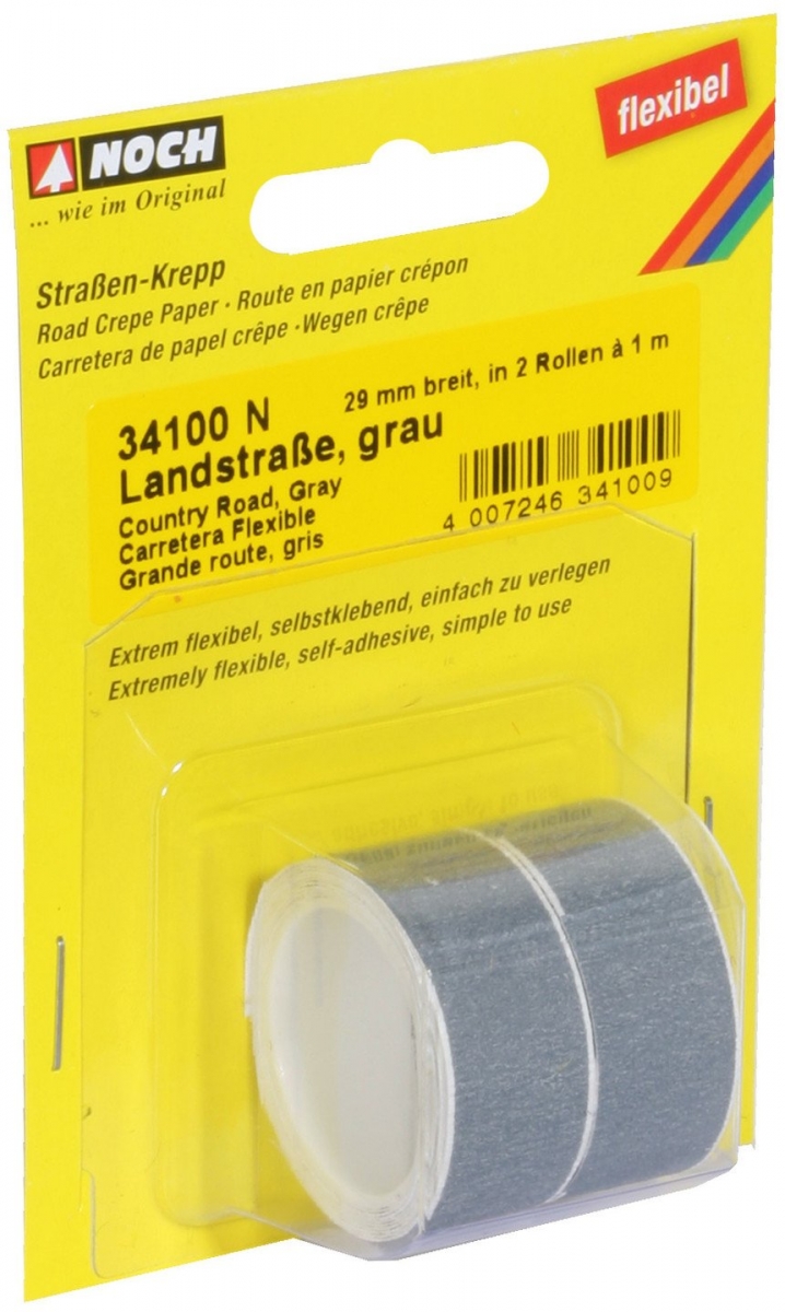 Get from A to B Quickly! NOCH Road Crepe Paper What would we do without country roads? The country road network is ideal for getting from A to B quickly. Country roads lead through beautiful patches of landscape and you can really enjoy the drive. People use country roads every day in order to reach their destination. Make detailed road scenes on your model layout even more customised and perfectly draw attention to them with the NOCH “Country Road”. You can hardly tell the difference between this model and the real thing. The model railway passengers quickly reach their destination. All roads lead to NOCH – because with NOCH Roads, Paths and Squares, you can very easily create a true-to-original road network. The benefits of the material are convincing: NOCH Road Crepe Paper is self-adhesive, exceptionally elastic, tear-resistant – and above all, very easy to work with. Bends, in particular, can be reproduced easily and effectively with NOCH Road Crepe Paper. In addition, NOCH Road Crepe Paper is ideally suited to the FALLER Car System. *** Photos may show additional scenery, structures, figures, vehicles, tools, etc which are not included. Please ask before ordering if you're unsure what's included. *** Width: 29 mm Length: 1000 mm Gauge: N Scale: 1:160 UPC: 4007246341009