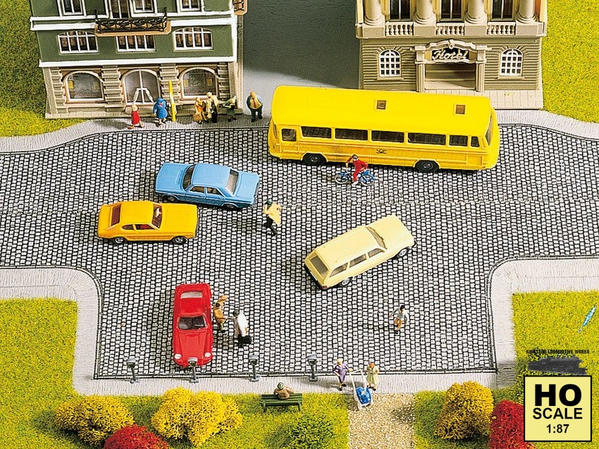 An Easy-Peasy and Super Realistic Paved Square! NOCH Road Crepe Paper The "Paved Place" in H0 gauge (1:87 scale) is ideal for making great landscape scenes even more lifelike and idyllic. Squares can be found in various landscape settings. Whether itβs a town square in the country, a market square in the city or another landscape scene, squares can be recreated in a very customised and creative way. The "Paved Place" is perfect for this. In a city scene, people bustle around the market when the weather is nice; in the village, villagers enjoy being together at the paved square. But a bus turning area or car park can also be created with the "Paved Place". Draw even more attention to your model landscape by recreating great squares and filling them with life. All roads lead to NOCH β because with NOCH Roads, Paths and Squares, you can very easily create a true-to-original road network. The benefits of the material are convincing: NOCH Road Crepe Paper is self-adhesive, exceptionally elastic, tear-resistant β and above all, very easy to work with. Bends, in particular, can be reproduced easily and effectively with NOCH Road Crepe Paper. In addition, NOCH Road Crepe Paper is ideally suited to the FALLER Car System. *** Photos may show additional scenery, structures, figures, vehicles, tools, etc which are not included. Please ask before ordering if you're unsure what's included. *** Width: 100 mm Length: 200 mm Gauge: H0 Scale: 1:87 (H0) Color: Grey Tones UPC: 4007246605705