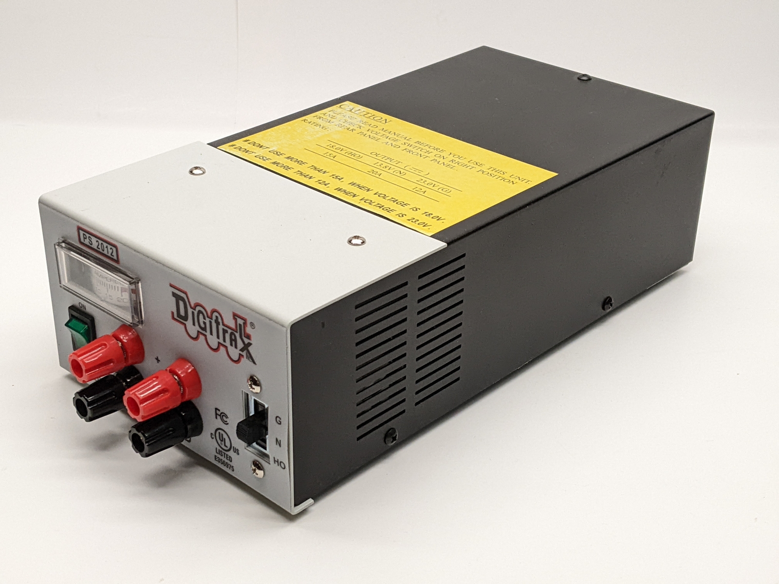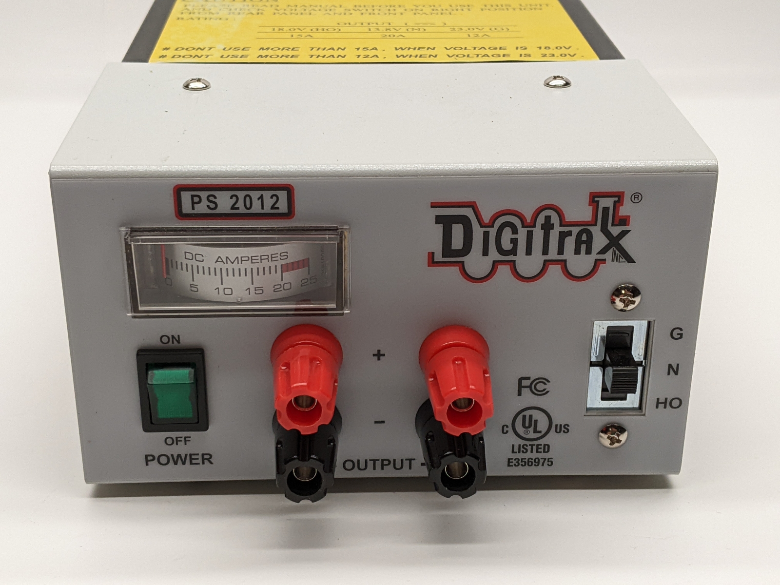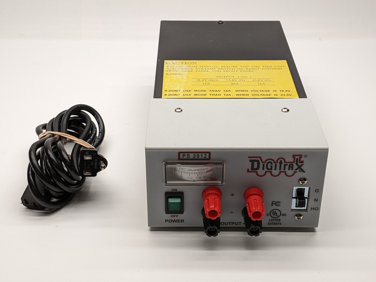 This power supply replaces the PS2012 to meet new efficiency requirements for DC power supplies. It delivers more power with less heat for more efficient operation. The 20 amp PS2012E regulated power supply can be used to operate up to 4 five amp boosters. Operate one or more boosters, great for 8 amp operations Selectable Scale switch for use with N, HO, or large scale (13.8, 16, and 23 VDC) Meets DOE VI efficiency standards UL and FCC certified Design Coordinated for use with Digitrax Products Built in over-current and over-temp protection DC output Ammeter On/Off Switch Integral Cooling Fan Consignment from an extensive collection being sold for health reasons. UPC: 652667130103