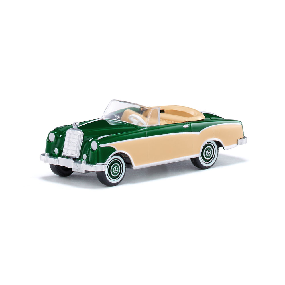 Anyone who raved about the understatement embodied by British convertibles had never taken a seat in the Mercedes-Benz 220 S. Dazzling the beholder with a combination of a light moss green body with beige flanks and an interior of the same colour, it epitomised driving in style, open air fun and the burgeoning wealth of its owner. WIKING has revitalised this classic - including the convertible elegance of its model years - from historic moulds and based on the creation conceived by legendary master model maker Alfred Kedzierski and has refined it further with a new interior. The aesthetics of this gem in the 1:87 selection of post-war automobiles is further enhanced by the rich details of the model. This Mercedes-Benz has remained an automotive legend - both as a model and in the original. When production of the 220 Cabrio ended in 1960, the era of the Ponton vehicles on German roads slowly came to a close as well. Body light moss green, interior beige with white steering wheel. Folding top beige. Chassis with floor panel as well as narrow radiator grille with Mercedes-Benz star finished with silver. Light moss green wheel rims with Mercedes-Benz star painted silver. Door handles and ornamental strips on the flanks painted silver. Beige all-surface design along the side of the body. Tail lights imprinted carmine red. Also, white wall rings on the side of the tyres. UPC: 4006190143028