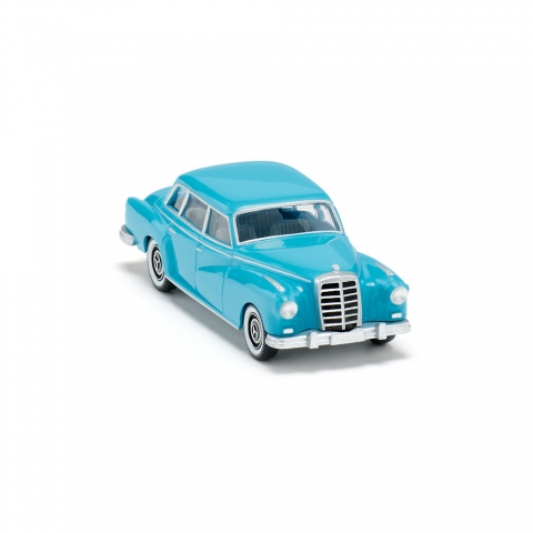 Radiantly saturated and splendidly glossy – the colour is proof that this Adenauer Benz dared to stand out from its peers at the time. As a matter of fact, the Mercedes-Benz 300 was predominantly produced with black or, at the most, dark blue paintwork. However, there were contemporaries that refused to follow this colour pattern. WIKING now evokes their memory with this light blue design. Today, the classic real-world original is considered rare and simultaneously serves as a reminiscence of Konrad Adenauer’s chancellorship – the name of the Federal Republic’s first chancellor was used to identify the 300 in common parlance. Body light blue, interior in silver grey. Radiator grille, chassis and bumpers painted chrome silver. Radiator grille surfaces imprinted black. Rear Mercedes-Benz star as well as model designation "300" imprinted silver. Side door handles, indicator inserts on the front fenders and ornamental strips likewise painted silver. Tyres upgraded with white walls rings. Hand-painted front headlamps. UPC: 4006190150026