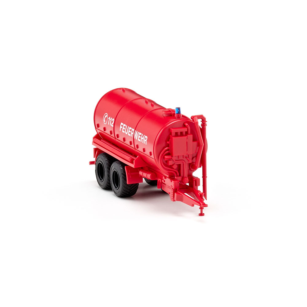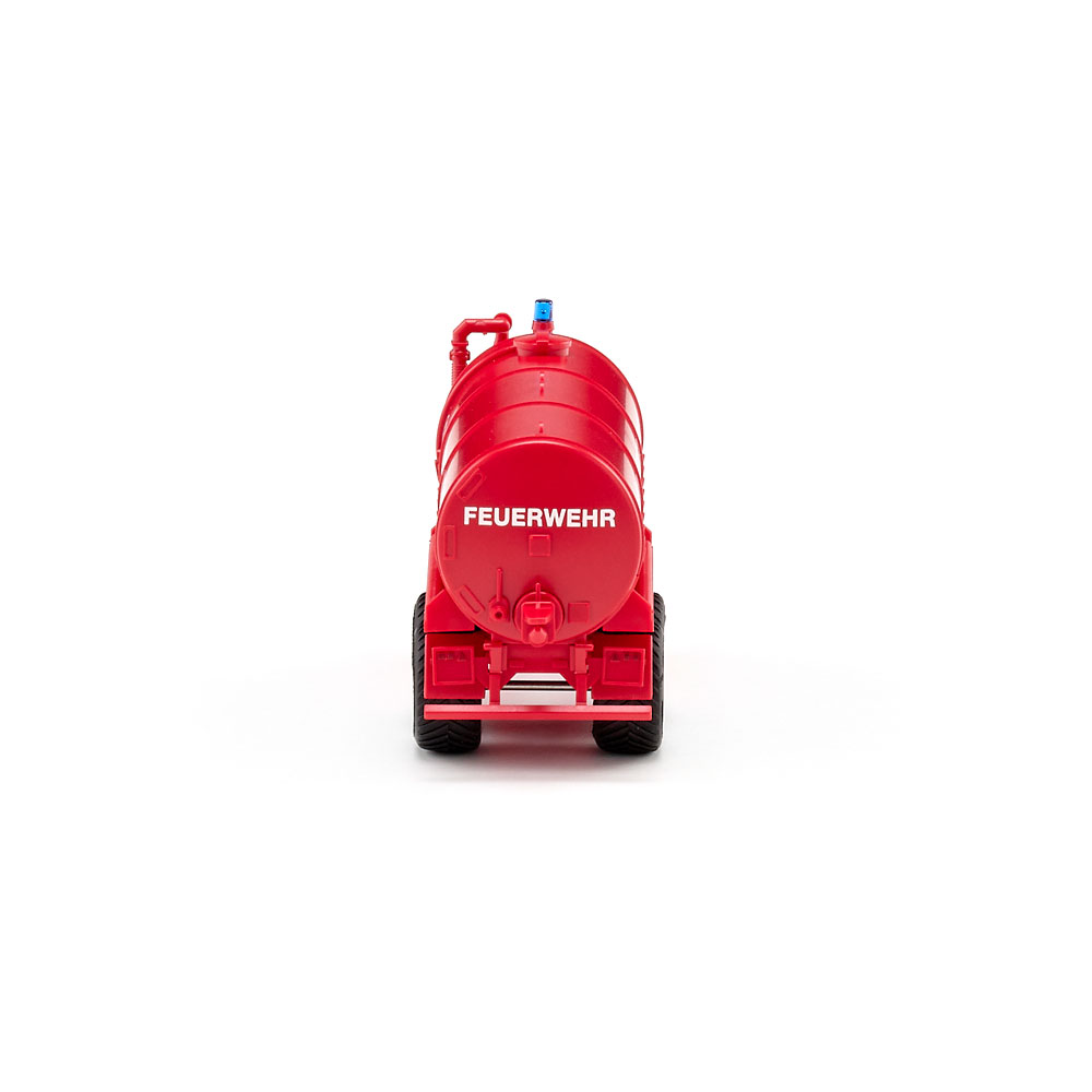 In response to the ever increasing number of forest and landscape fires, modern fire fighting concepts everywhere call for expanded capacities of extinguishing water. This is why vacuum tank trailers have become a part of certain fire brigade fleets thanks to their formidable transport volume. WIKING has miniaturised a water tanker that will primarily be pulled by water supply tractors when emergency hits. Equipped with their own suction pump, these tractor-trailer units are capable of providing effective assistance. Chassis with draw-bar and tank container, lateral suction hoses and attachment fittings red, wheel rims in black. Transparent blue warning light attached at the front. White “Fire brigade” lettering with emergency call number on the side. UPC: 4006190382373