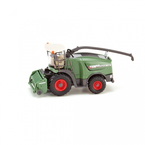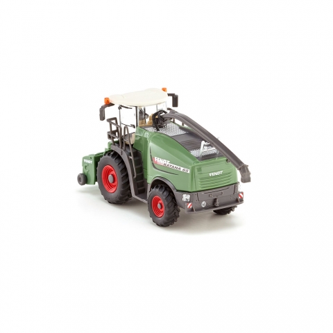 Chassis with fenders and steps in gray, rear hood in Fendt green. Interior of the cab with seat and dashboard as well as the steering wheel in cream beige. Pick-up front end in Fendt green. Ejector in gray. Rear hood printed with “Fendt Katana” in gray and red. Cab window pane borders printed black. Red rims. UPC: 4006190389600
