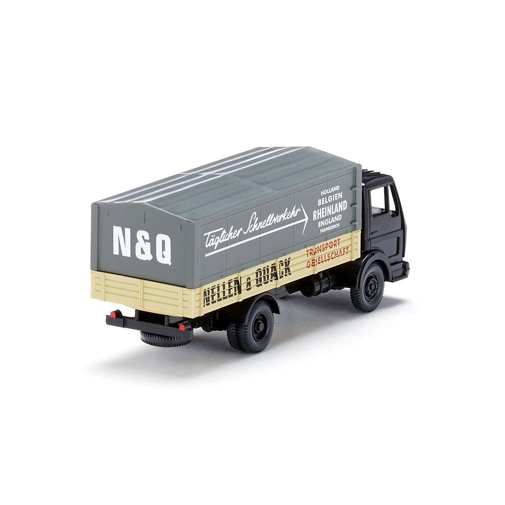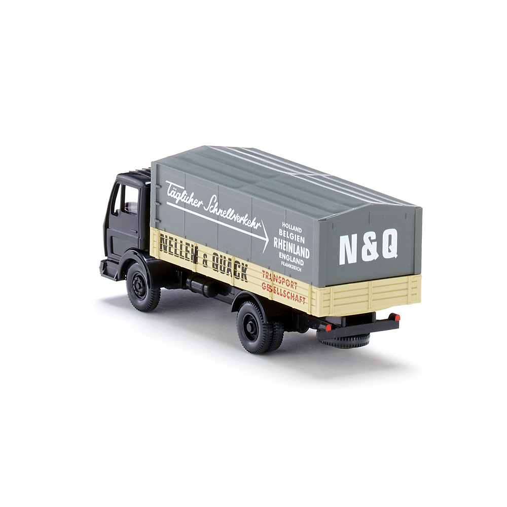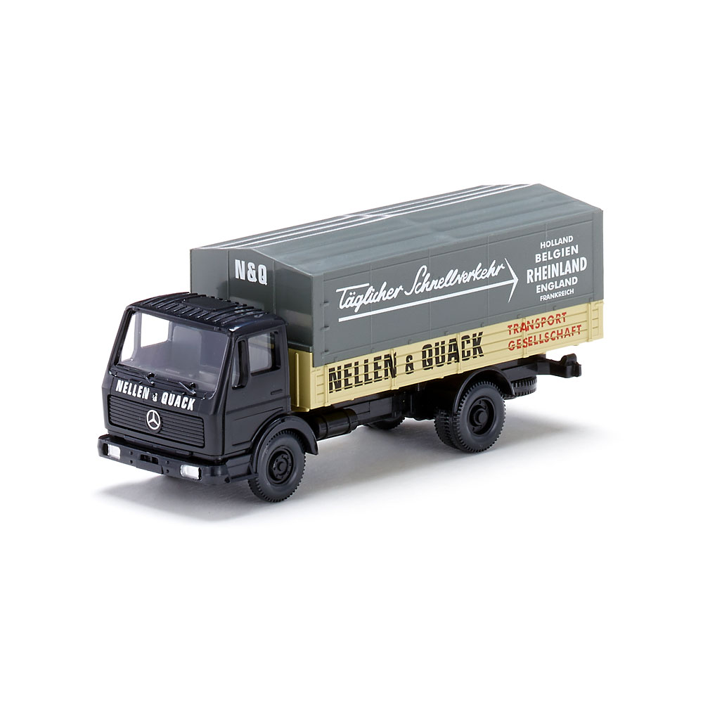 They travelled from the Lower Rhine to the UK – a regular haulage dash, as it were. The Nellen & Quack forwarding company initially ran short hood trucks – WIKING already issued a model of these – and then also ran the new generation “NG” from Mercedes-Benz. Carl Hermann Nellen and August Quack founded the company in Rheydt in 1884. Reconstruction started in 1948, and in 1958 a storage area of 7000 square metres and a respectable fleet were available. After belonging to the BTL group for many years, in 2008 Heiner Hoffmann acquired all shares and with his team recreated a medium-sized, owner-led company – once again under the name Nellen & Quack. Driver's cab and chassis plus fenders and wheels, black. Interior olive green. Black radiator grille with silvered ornamental strips and Mercedes-Benz star. Door handles painted silver, indicators printed orange. Hand-painted headlamps. Flatbed green beige, tarpaulin grey. Front of driver's cab and side of flatbed printed with “Nellen & Quack” in black, flatbed also printed “Transport Gesellschaft” in red lettering. Tarps printed “Täglicher Schnellverkehr Holland Belgien Rheinland England Frankreich” in white lettering. Tail lights red. UPC: 4006190437028