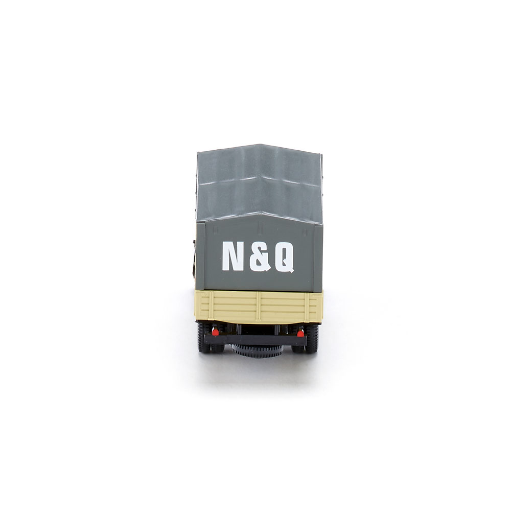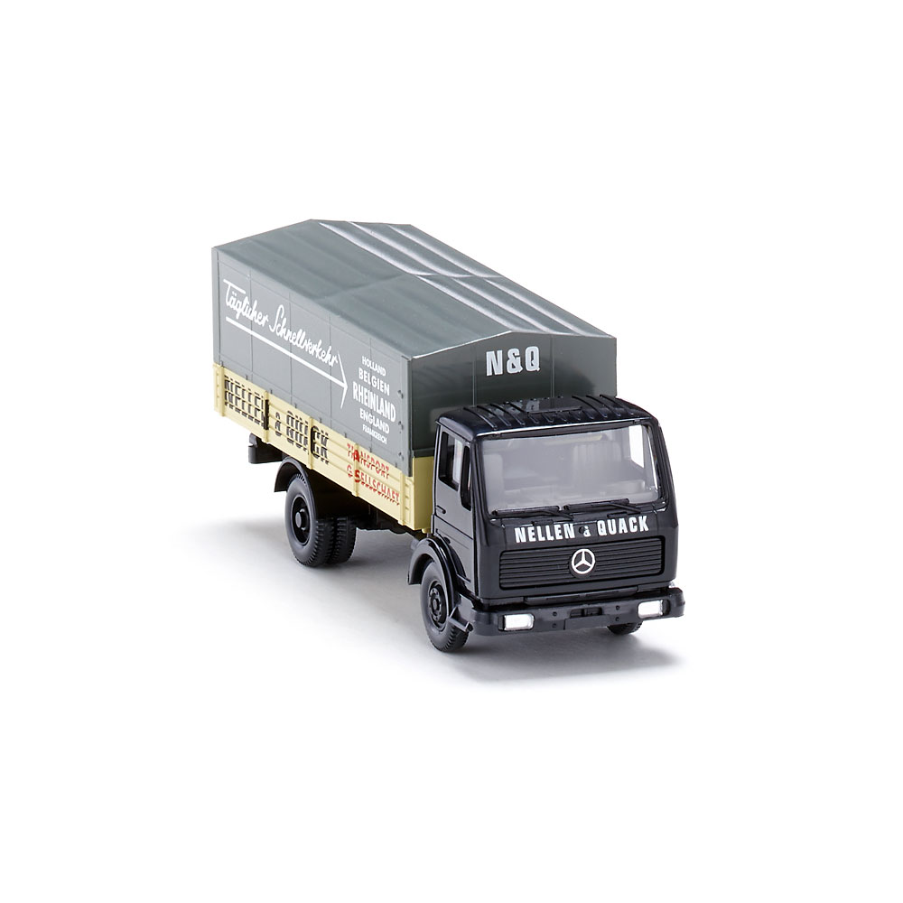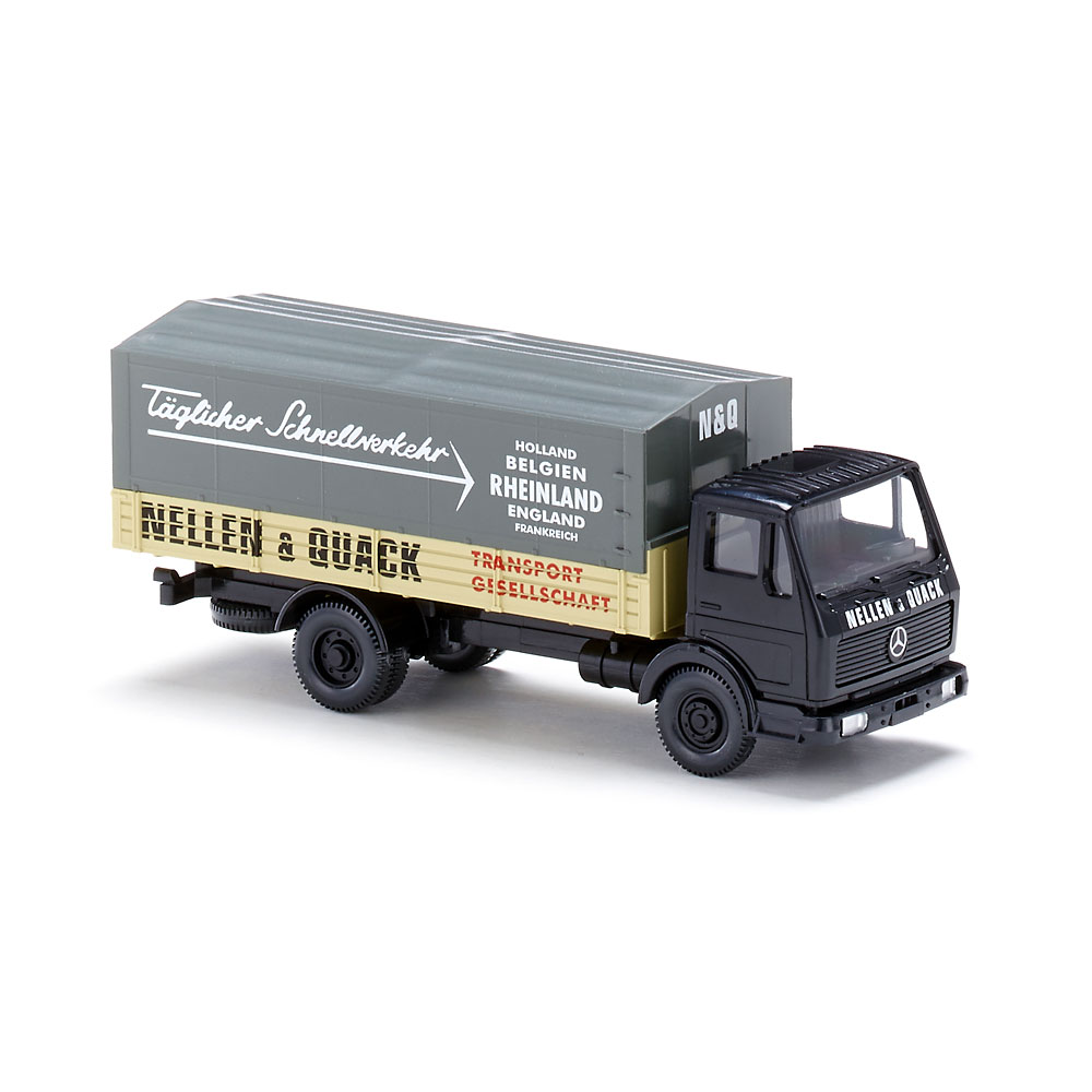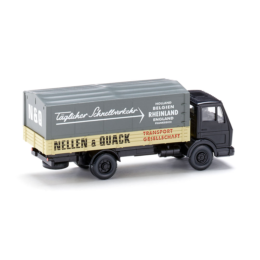 They travelled from the Lower Rhine to the UK – a regular haulage dash, as it were. The Nellen & Quack forwarding company initially ran short hood trucks – WIKING already issued a model of these – and then also ran the new generation “NG” from Mercedes-Benz. Carl Hermann Nellen and August Quack founded the company in Rheydt in 1884. Reconstruction started in 1948, and in 1958 a storage area of 7000 square metres and a respectable fleet were available. After belonging to the BTL group for many years, in 2008 Heiner Hoffmann acquired all shares and with his team recreated a medium-sized, owner-led company – once again under the name Nellen & Quack. Driver's cab and chassis plus fenders and wheels, black. Interior olive green. Black radiator grille with silvered ornamental strips and Mercedes-Benz star. Door handles painted silver, indicators printed orange. Hand-painted headlamps. Flatbed green beige, tarpaulin grey. Front of driver's cab and side of flatbed printed with “Nellen & Quack” in black, flatbed also printed “Transport Gesellschaft” in red lettering. Tarps printed “Täglicher Schnellverkehr Holland Belgien Rheinland England Frankreich” in white lettering. Tail lights red. UPC: 4006190437028