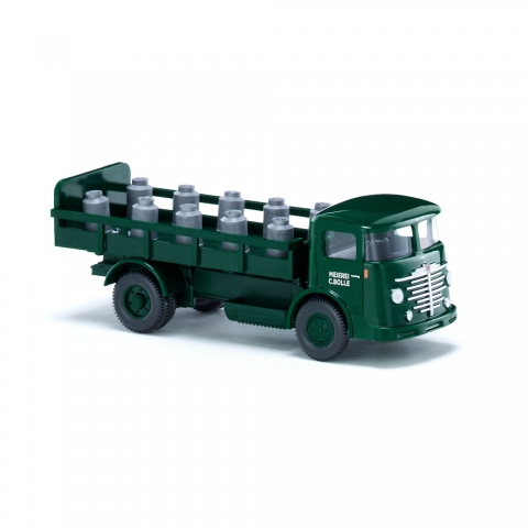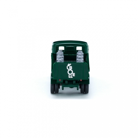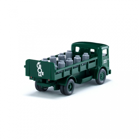 And today, everyone who sees it has fun like “Bolle”! This is because WIKING is reuniting us with the Büssing 4500 in the form of a miniature that is as agile as the original Braunschweig lorry and made deliveries in the country and in the cities alike. The divided City of Berlin especially came to adore this “little” Büssing as it made the C. Bolle dairy and its reliable supply of fresh milk highly popular. WIKING used historic moulds to combine this classic with the same flatbed with rails that originated under the aegis of master model maker Alfred Kedzierski and went on to be used in the horse-and-cart combination for many years as well. The traditional model makers are well aware of how significant the Büssing series have been for WIKING’s history. In light of the success of its unglazed version, it is no wonder that the Büssing type 4500 is now enjoying a renaissance at the model makers. Now, naturally, as a glazed version - but without abandoning its unmistakable formal aesthetics that springs from its WIKING DNA. Boasting a payload of 4.5 tonnes and a total weight of 8.7 tonnes, the type 4500 is intended to round out the distribution transport fleet. Driver's cab and chassis plus fenders and wheel rims dark green. Interior with integrated steering wheel iron grey. Driver's cab doors with lettering Meierei C. Bolle imprinted silver. Silver door handles and indicators yellow orange. Bolle logo and red tail lights on the rear imprinted silver. Window frames imprinted black along with ornamental strips and door handles painted silver. Indicators in orange. Injection-moulded element with silver-grey milk churns as cargo. UPC: 4006190476058