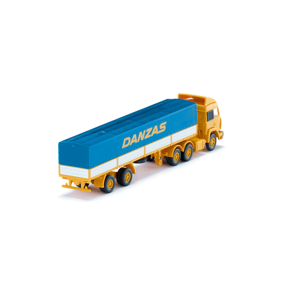 A name with the iconic ring of an international forwarding company: “Danzas” in the 1980s was the epitome of international transports all across Europe. After previously releasing the Magirus 235 D with aluminium flatbed body, WIKING is now launching the Iveco successor as a flatbed tractor-trailer. Even after Magirus lost their independence, “Danzas” continued to use the subsequent series of the Iveco Group. However, the Danzas Group too ultimately fell victim to the internationalisation and merger mania of the logistics industry. In 1999, Deutsche Post first procured the majority of the shares in the publicly traded Danzas Holding before completely acquiring the company shortly thereafter and integrating it into the Post Group. To unify their brand identities, the group merged DHL, Deutsche Post Euro-Express and Danzas to form DHL – relegating Danzas to the history books. Tractor unit with yellow gold driver's cab, interior tent grey. Roof spoiler and chassis with cardan shaft and double fenders yellow gold. Wheels also yellow gold. Tail lights imprinted carmine red. Front of driver's cab with azure blue Danzas imprint. Radiator grille with silver Iveco lettering. Hand-painted front bumper. Flatbed semi-trailer with yellow gold flatbed and silver area imprint. Chassis and axle mounting as well as wheel rims yellow gold. Azure blue tarp with yellow gold Danzas lettering. UPC: 4006190517034