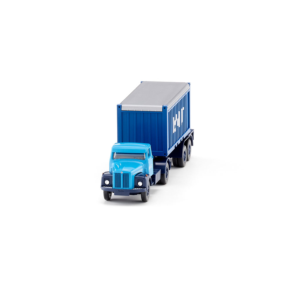 Four decades ago, the Scania L111 was a daily sight at container ports - not only in Scandinavia, but in Germany as well. The bonnet tractor unit ensured that the container logistics operations ran smoothly - also in the colours of container transport company “M.A.T.”. To celebrate its model première, WIKING has miniaturised the Scania bonnet truck with the corporate design of “M.A.T.” and lets the trailer truck roll up with an open top container. This tractor-trailer unit is a testament to the traditional model makers’ considerable involvement - especially in the Swedish market. This is why the Scania L111 will be well received there as well. Tractor unit driver’s cab with sun visor light blue. Chassis with cardan part and wheel rims sapphire blue. Interior grey blue. Radiator grille imprinted sapphire blue. Red silver Scania logo on the radiator grille. On the sides, model designation Scania 111 as well as Scania lettering and door handles imprinted silver. Additional “M.A.T.” lettering in silver. Chassis with orange indicators, checker plate painted silver and red tail lights on the rear. Semi-trailer with chassis, double fenders and wheel rims sapphire blue. Chassis with silver “M.A.T.” lettering on the rear. Tail lights imprinted red. Gentian blue open top container with silver roof and silver “M.A.T.” imprint on the sides. UPC: 4006190526043