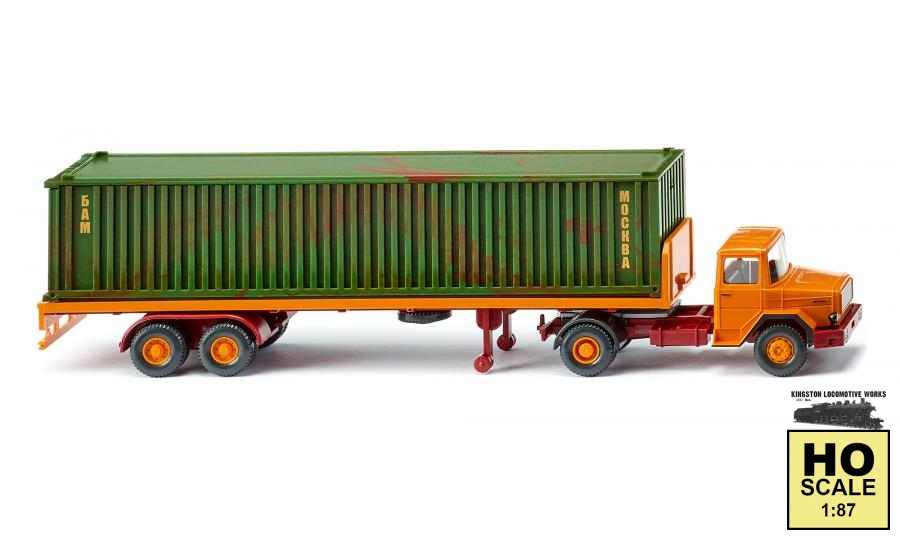 This flatbed semi-trailer truck is definitely a square hood that can handle anything! This time, WIKING dispatches it with a 40-foot container. While the driver's cab had been included in the traditional model makers’ stock of moulds for decades, the tractor chassis had been missing and is now added following the construction of new moulds, finally giving the last square hood from Ulm the honour it deserves. The square hood cab WIKING originally conceived in 1974 now receives new glory as a flatbed semi-trailer truck carrying a formidable load. Driver's cab with wheel rims yellow orange, interior basalt grey, chassis with trailer coupling and cardan shaft brown red. Rear fenders black-grey. Fifth wheel plate silver, headlamp strip black. Radiator grille imprinted black-grey with silver Magirus logo and Magirus-Deutz lettering. Side door handles with outer fender strips along with step edges and handle black-grey. Tail lights red. Semi-trailer with yellow orange platform and wheel rims. Double fenders on the rear as well as axle cover and support rollers brown red. Steel container with doors emerald green mixed with oxide red. Container imprint on the sides with saffron yellow lettering. Reflective triangles on the rear as well as tail lights on the semi-trailer traffic red. UPC: 4006190554053