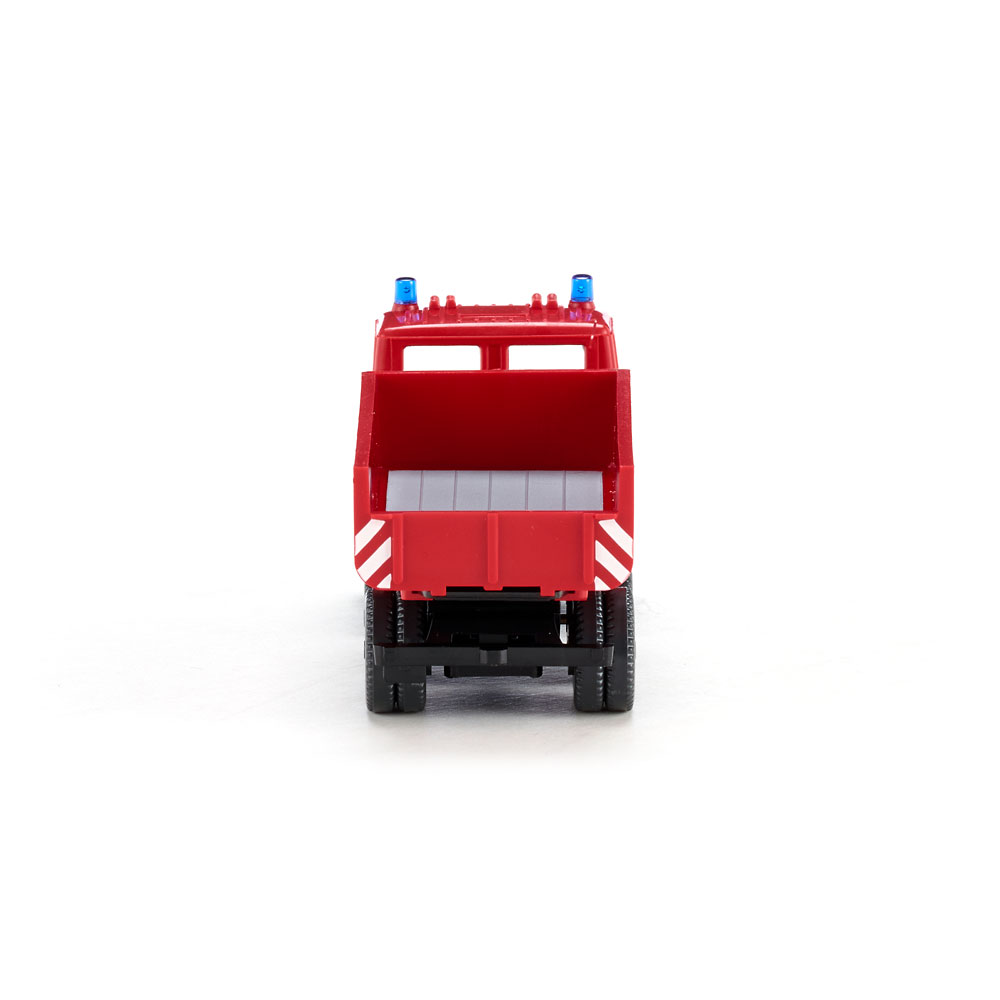 Driver's cab red with transparent blue warning light inserted in red base. Chassis, Cardan part and search light black, interior anthracite grey. Radiator grille black with silver-painted Mercedes-Benz star. Bumper headlamps and searchlight hand-painted in silver. Ramp black, skip red with silver base insert. Wheel rims in black. "Feuerwehr" lettering on front of the driver's cab. Skip imprinted with warning lights and "Feuerwehr" lettering on the sides. UPC: 4006190624039
