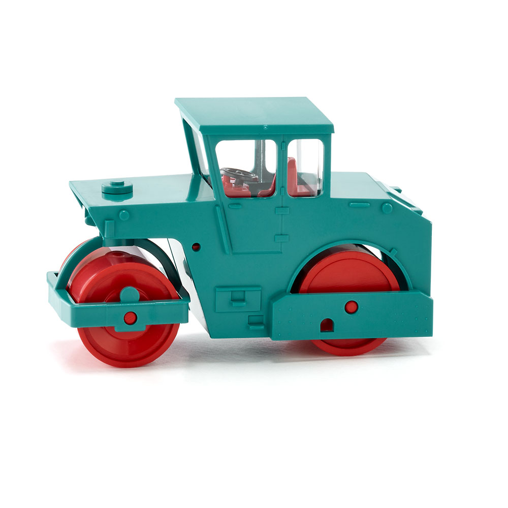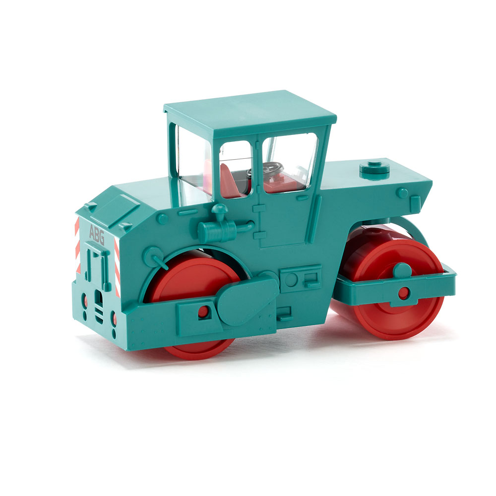 Road roller body water blue, chassis floor and steering wheel along with roof and air filter water blue. Seat and roller red. Steering wheel black. Headlamps painted silver, AGB lettering in black. Rear and manufacturer lettering ABG black, with red-white warning hatching. Tail lights printed carmine red. UPC: 4006190650052
