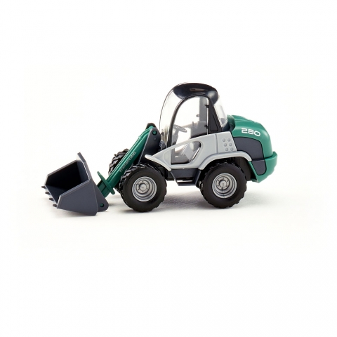 Chassis in black, machine body and interior dark grey, rear hood and spoiler as well as bucket arm green. Bucket in dark grey, cab black, side flanks in contrasting light blue, bucket arm imprint “Kramer Allrad” grey, imprint on the side of the rear hood with type designation “280” grey. Wheels silver. UPC: 4006190653053