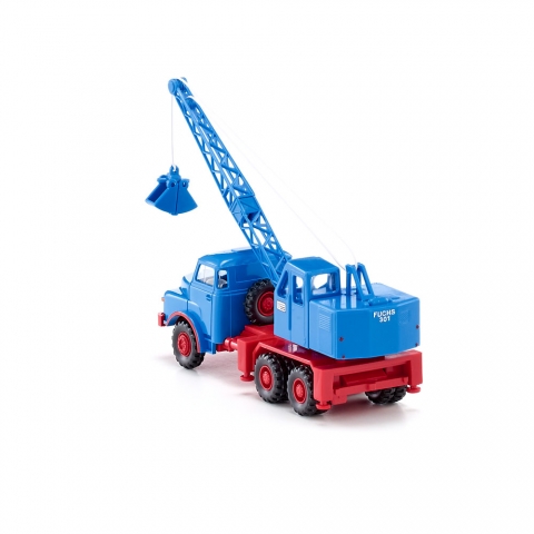 The classic MAN bonnet truck is a great match with this specialist. The Fuchs dragline excavator is put into action on top of the three-axle chassis. Back in the day, especially during the construction boom of the 1960s, construction companies - and municipalities - enhanced the tried-and-tested Fuchs dragline excavator F 301 by mounting them on these robust chassis, giving them unprecedented mobility. Since the square hood was valued as indestructible, a large number of Fuchs mobile cranes were kept in service until the 1990s. Today, the F 301 is the most recognizable Fuchs dragline excavator, which is not unexpected given the more than 15,000 units that have sold of this model over the span of two decades. In hindsight, the success of this model should come as no surprise seeing as the manufacturer continuously developed the dragline excavator over the years of its production and made it available with a host of equipment options. Driver's cab sky-blue, interior light grey. Chassis with cardan part and wheel rims traffic red. Headlamps hand-painted in silver. Radiator grille surface signal red with silver ornamental trim and MAN and Diesel lettering plus Büssing logo. Front indicators signal orange. Edge of fenders designed in traffic red. Crane structure with body block and cab plus winch along with the interior with steering wheel and recessed grip sky blue. Platform traffic red. UPC: 4006190662062