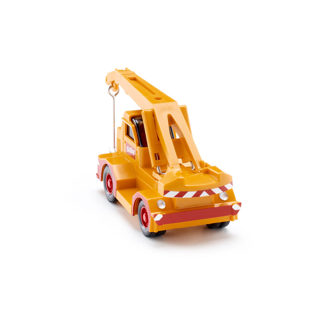 Body, base mat, axle mount and also folding arm with crane arm and rotating mount with piston holder and cylinder in daffodil yellow. Crimson red wheel rims. Side lettering on door with red and white Bölling lettering. Demag label on engine bonnet and cooling grill and black and silver. Red and white warning strips around the body. Counterweight on crane body also with red and white warning markings. Front headlights hand-painted silver. UPC: 4006190680028