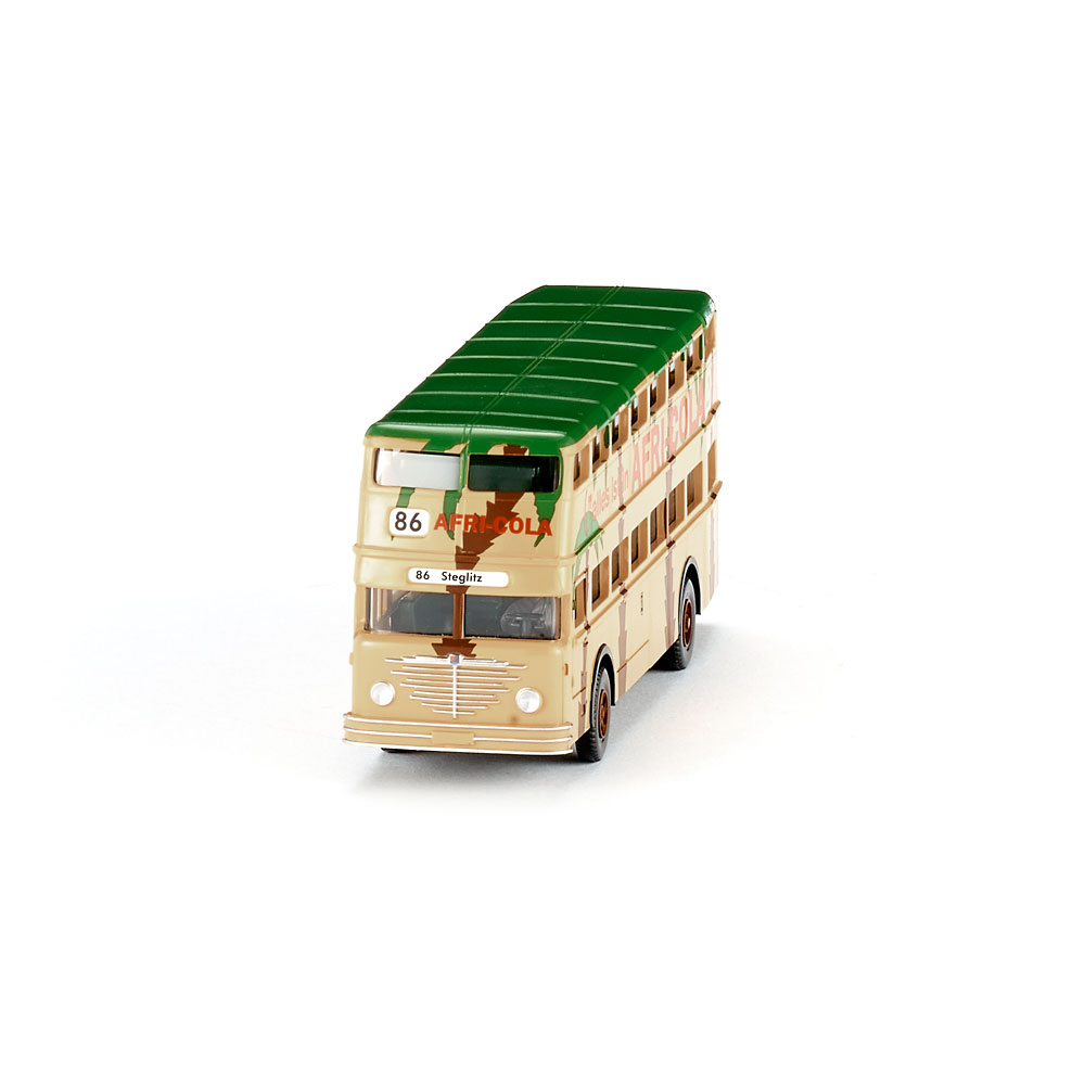 The Bluna bus was sure to make you crave the fizzy drink! The Büssing D2U used to turn heads wherever it showed up in West Berlin. Unlike today, full-surface designs stretching across buses were not the rule, but the exception - even at the BVG. The towering letters with their luminous Flower Power orange were embedded in a stylised palm tree landscape, testifying to the exotic origin of the orange soda. In all likelihood, the double-decker buses used to pass WIKING’s former Berlin modelling workshops in Lichterfelde dozens of times every day – the D2U left their mark on the years of Germany’s Economic Miracle in West Berlin. This is also why the Bluna bus bears Steglitz on its destination sign. For Berliners, the characteristic double-decker buses with the finely detailed Büssing spider on the front still represent the years of awakening, experienced in the west of the divided city, and reflected in the publicity on the omnipresent buses. Body beige, interior moss green, steering wheel black-grey. Wheels fawn. Chassis in black. Hand-painted headlamps, bumper and Büssing spider imprinted chrome silver. Bus driver basalt grey with hand-painted face. Destination sign “Steglitz” with route number “86”. Bumpers on side, fender margins, and BVG logo printed in black. Elaborate Bluna/ Afri-Cola advertisement with palm tree design covering the entire body. Tail lights red. UPC: 4006190722056