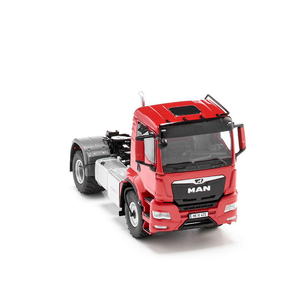 The traditional model makers are extending the applications of their agricultural vehicles from the field to the road. With the release of the MAN TGS 18.510 4x4 WIKING is launching their first model truck as a 1:32 scale miniature. The driver’s cab with its bright red paintwork makes the purchasing decision for the collector a no-brainer, as the tractor unit turns heads with its colour scheme alone. It is this very tractor unit, which has been miniaturised for its début in the design with permanent all-wheel drive, that builds a bridge to the agricultural theme in the 1:32 scale. And this is where the originals of these combination vehicles are used every day, shuttling increasingly between use on the field, on the road and in further processing. The originals impress with the desired high payload and move about the field with plenty of traction. Imposing figure thanks to raised chassisWIKING is presenting the dual-axle solo tractor unit with the greatest level of detail and decoration. The model is a combination of plastic and die-cast zinc components. The mix of the two materials elevates the realistic impression of the 1:32 miniature to perfection. The tractor unit impresses with its numerous detailed, movable elements, which conform entirely to the internationally beloved and reputable scale and its possibilities. The doors can be opened – uncovering the view inside the cab and giving an example of WIKING’s typical and absolute dedication to detail. The model also has a radiator grille that can be swung up to expose the built-in power units. The front axle is steerable, while the tilting driver's cab provides a view of the precisely reproduced engine underneath. Moreover, the trailer coupling on the rear of the tractor unit enables hassle-free combination with the trailers already available in the WIKING agricultural range. This allows it to be combined with the model première to form attractive combination vehicles. The tyres of the début model conform to the all-wheel function and naturally have an all-terrain tread. The element that gives this model a particularly striking look is its raised chassis and its towering exhaust pipe. The fifth wheel plate comes with a lever that is pivoted towards the front and can be used to secure the semi-trailer. WIKING remains true to its model building ambitions in every phase: The model makers naturally do not skimp on the comprehensive range of additional equipment learned in the 1:32 scale. Comprehensive fittings as the side mirrors, the sun visor and windscreen wipers further underscore the premium look of this precision model. Another attachment WIKING has added is a tyre pressure control system. UPC: 4006190776530
