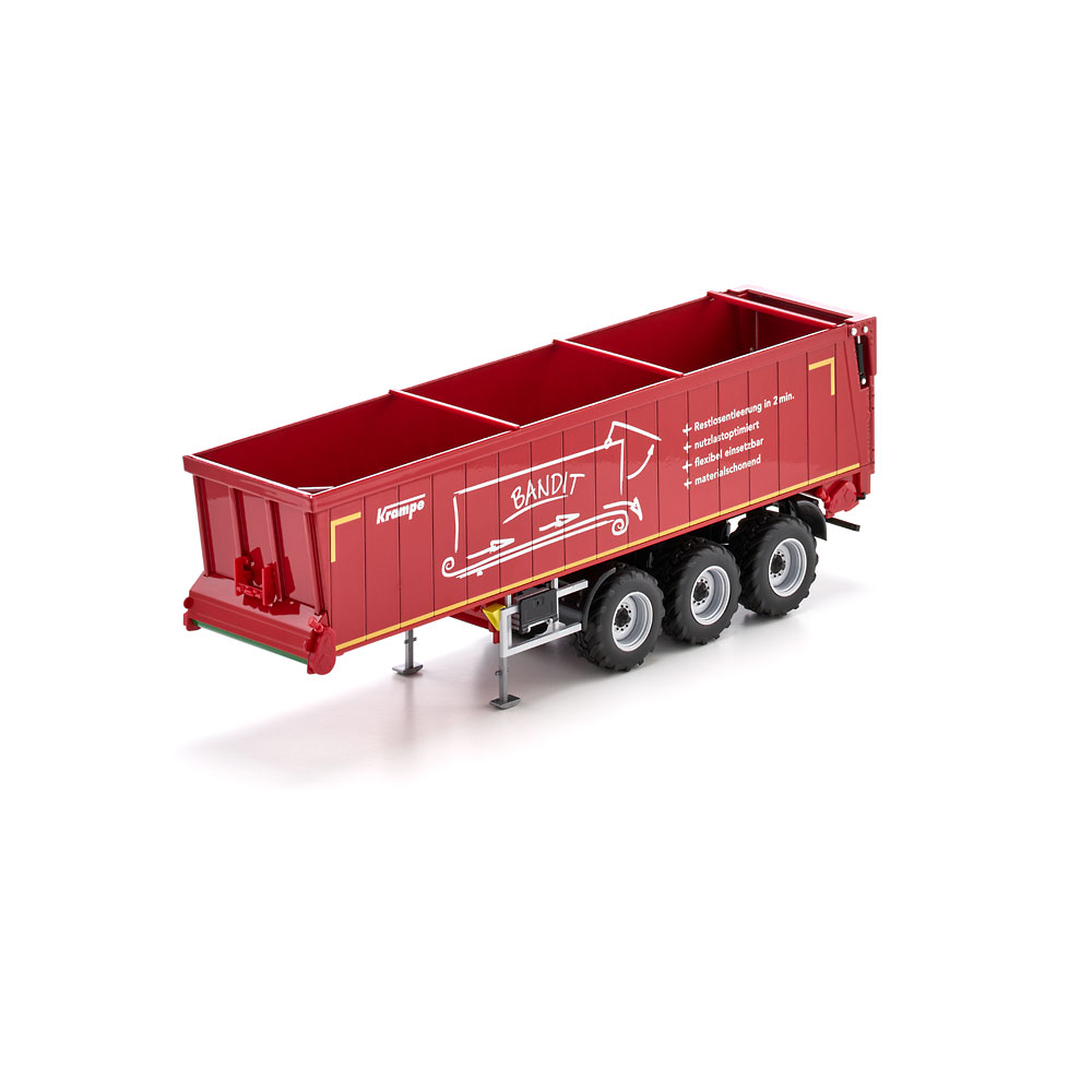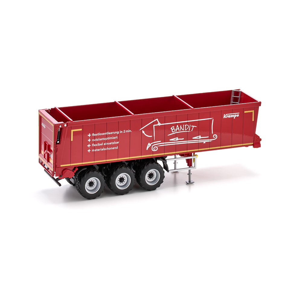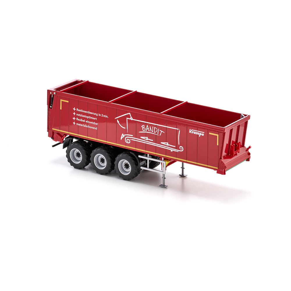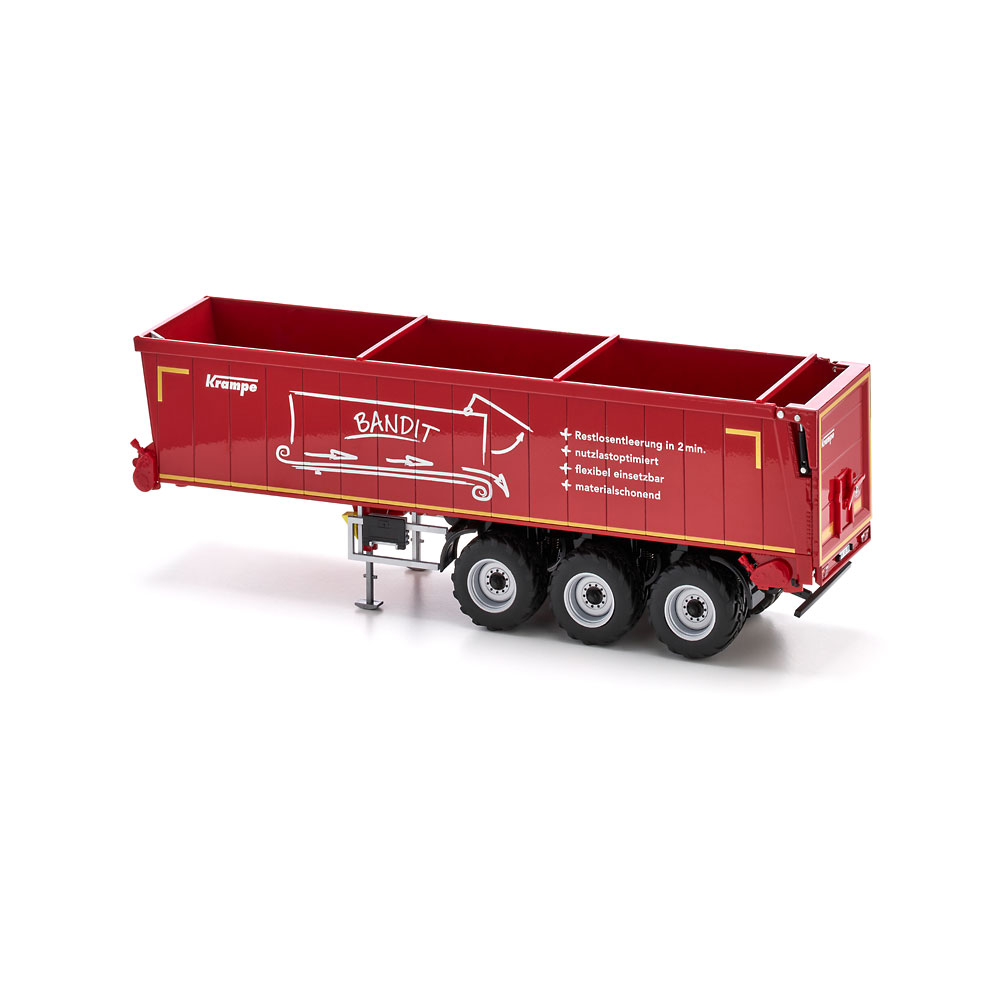 Embodying the latest generation of transport vehicles in agriculture, it serves as an alternative to the familiar push-off trailers, which used to be reigning in the domain of bulk goods: Thanks to its ground conveyor technology, the Bandit SB 30/1070 semi-trailer from Krampe is not raised in everyday operation and can therefore also be unloaded in low halls. WIKING’s miniaturised version of the horizontal unloader is equipped with true-to-scale features and rolls into the series draped in Krampe’s signature red. The system is distinguished by its high degree of stability during the unloading process, ensuring reliability and opening up a broad range of applications. In addition to loads such as grain, silage, manure, wood chip, pellets or shredded products, loads that stick – such as compost and slurry – can be unloaded leaving hardly a trace. When discharging shape-retaining goods such as compost, the conveyor belt system of the Bandit SB II 30/1070 achieves an unusually high material cone and virtually pushes both tractor unit and trailer forward during the unloading process. This is ideal as it offsets the insufficient grip caused by the relief of the semi-trailers rear axle and lets the combination start moving again when it needs to exit the unloading site. The swift unloading time of 80 seconds is another plus during short cycle unloading. Also of great benefit is its easy cleaning compared to the push floor system. Equally ideal is the non-slip floor, which is also suited for transporting palletized goods, bales of straw or big packs when combined with the loading option. The Krampe original has a permissible gross weight and payload of 35 tonnes and 27 tonnes, respectively. All functions can be simulated true to scaleThe tailgate can, of course, be moved up all the way to allow for the effortless unloading of the cargo. When the skip is closed, a lever on the rear can be used to release the discharge opening to improve the dosing of fine bulk goods. Moreover, the supports in the front area of the semi-trailer can be variably extended, ensuring that the uncoupled semi-trailer will be propped up with the same stability as its real-life sibling. As you can expect from WIKING, the wheel chocks have been given particular attention. They have been inserted on either side of the semi-trailer and can be placed in position under the wheels when necessary. UPC: 4006190776578