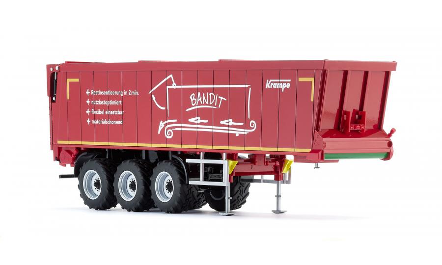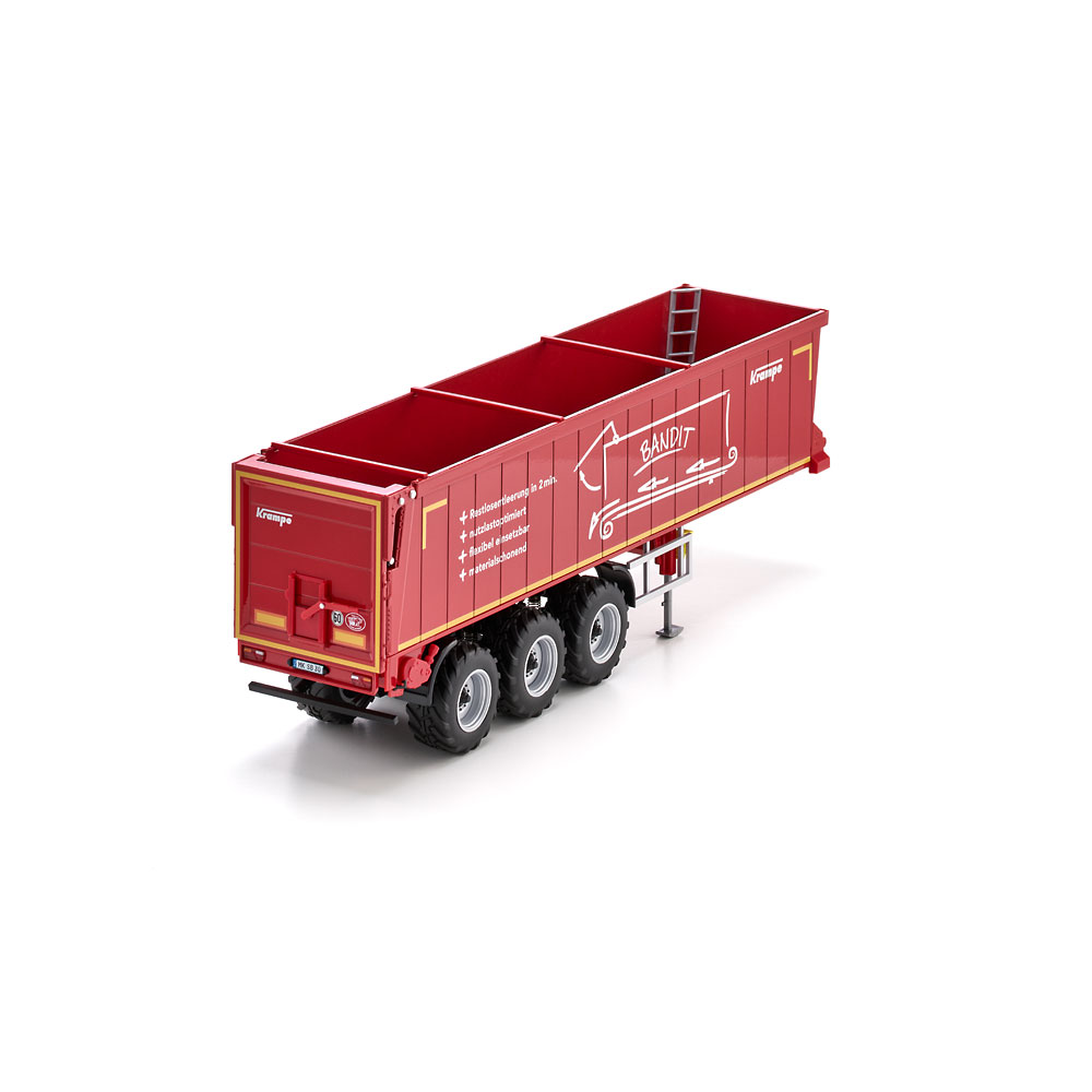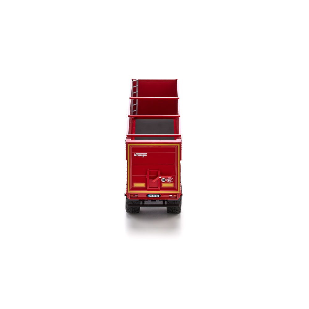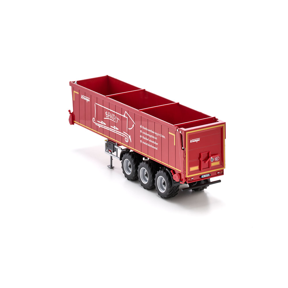 Embodying the latest generation of transport vehicles in agriculture, it serves as an alternative to the familiar push-off trailers, which used to be reigning in the domain of bulk goods: Thanks to its ground conveyor technology, the Bandit SB 30/1070 semi-trailer from Krampe is not raised in everyday operation and can therefore also be unloaded in low halls. WIKING’s miniaturised version of the horizontal unloader is equipped with true-to-scale features and rolls into the series draped in Krampe’s signature red. The system is distinguished by its high degree of stability during the unloading process, ensuring reliability and opening up a broad range of applications. In addition to loads such as grain, silage, manure, wood chip, pellets or shredded products, loads that stick – such as compost and slurry – can be unloaded leaving hardly a trace. When discharging shape-retaining goods such as compost, the conveyor belt system of the Bandit SB II 30/1070 achieves an unusually high material cone and virtually pushes both tractor unit and trailer forward during the unloading process. This is ideal as it offsets the insufficient grip caused by the relief of the semi-trailers rear axle and lets the combination start moving again when it needs to exit the unloading site. The swift unloading time of 80 seconds is another plus during short cycle unloading. Also of great benefit is its easy cleaning compared to the push floor system. Equally ideal is the non-slip floor, which is also suited for transporting palletized goods, bales of straw or big packs when combined with the loading option. The Krampe original has a permissible gross weight and payload of 35 tonnes and 27 tonnes, respectively. All functions can be simulated true to scaleThe tailgate can, of course, be moved up all the way to allow for the effortless unloading of the cargo. When the skip is closed, a lever on the rear can be used to release the discharge opening to improve the dosing of fine bulk goods. Moreover, the supports in the front area of the semi-trailer can be variably extended, ensuring that the uncoupled semi-trailer will be propped up with the same stability as its real-life sibling. As you can expect from WIKING, the wheel chocks have been given particular attention. They have been inserted on either side of the semi-trailer and can be placed in position under the wheels when necessary. UPC: 4006190776578