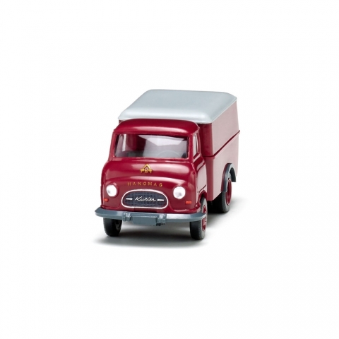 Even Master Röhrich swore by the Hanomag courier van While already staggering at 61,472, the number of Hanomag Kurier vans that ran off the production line in 1967 is likely to have been dwarfed by the models produced at WIKING. The Hanomag Kurier included in the 1:87 product range was regarded as a light express lorry engineered by the commercial vehicle manufacturer Hanomag. The all-steel cab of the model stood for a contemporary body design, which remains highly sought after to this day thanks to its curved shapes. Bulged only to the slightest degree, the bow of the vehicle was so type-defining that the task of creating an authentic miniaturisation posed no difficulty to WIKING’s master model maker Alfred Kedzierski. Hanomag presented the smallest and most commonly driven Kurier as early as 1958. The lorry manufacturer from Hanover furnished it with the same 50 hp diesel engine that had powered its predecessor. Weighing in at a total weight of 3.9 tonnes, it was able to carry a payload of nearly 2 tonnes. In 1964, the line was complemented by a petrol engine with an output of 60 hp. The Hanomag finally became immortal - at the latest with the release of the legendary film “Werner - Beinhart!” in which the vehicle served as Master Röhrich’s “company car.” Box upper and lower part purple red. Roof of the box window grey. Chassis iron grey, interior with steering wheel mouse grey, grille surface and grille frame with Kurier lettering imprinted silver. Indicators in traffic orange. Hanomag logo and lettering imprinted in the brand’s gold colour. Tail lights traffic red. UPC: 4006190344012
