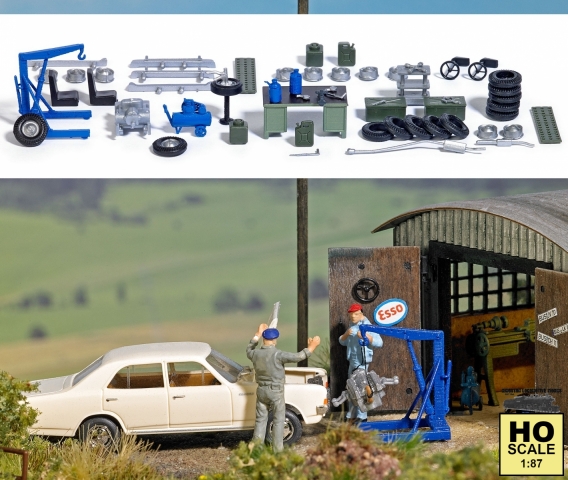 Kit with a large assortment of equipment and machines for starting a backyard vehicle workshop. Includes an assembly crane, motorblock, tool wagon, handtools, tool kit, car jack, 12 tires and 12 rims, car seats, steering wheels, shock absorbers, gas cans, etc.. *** Photos may show additional scenery, structures, figures, vehicles, tools, etc which are not included. Please ask before ordering if you're unsure what's included. Most structures are kits which require assembly. *** UPC: 4001738011845