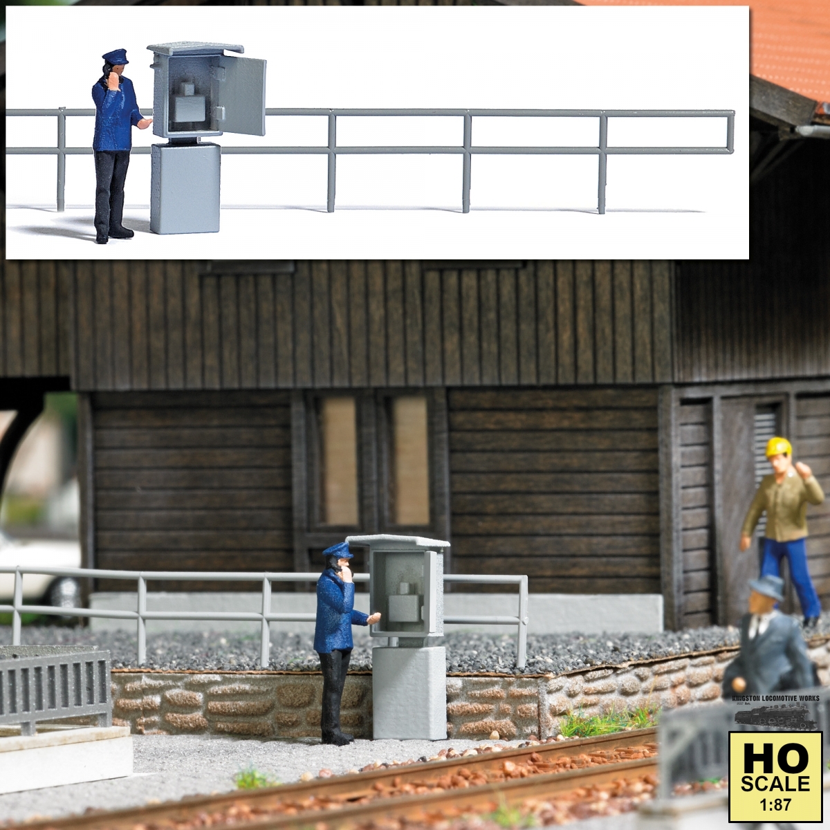 Signal post telephone with railing and railway official of Deutsche Reichsbahn (GDR). *** Photos may show additional scenery, structures, figures, vehicles, tools, etc which are not included. Please ask before ordering if you're unsure what's included. Most structures are kits which require assembly. *** UPC: 4001738078480