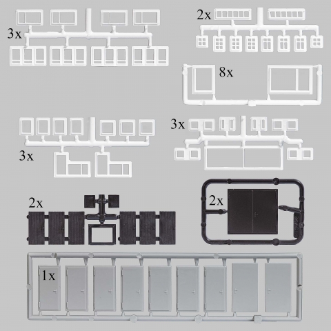 Richly equipped craft kit with windows and doors in various shapes. Suitable for DIY buildings and any further decoration. The plastic injection moldings come in different sizes and are therefore suitable for various scales. *** Photos may show additional scenery, structures, figures, vehicles, tools, etc which are not included. Please ask before ordering if you're unsure what's included. Most structures are kits which require assembly. *** UPC: 4001738019988