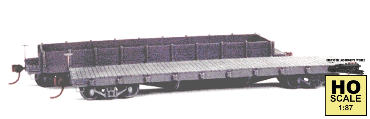 40' STEEL FLAT WITH PARTS FOR LOW SIDE WOOD GONDOLA ERA 1916 TO PRESENT INJECTION MOLDED STYRENE KIT. Builds one car (both possible styles shown). Couplers not included. |