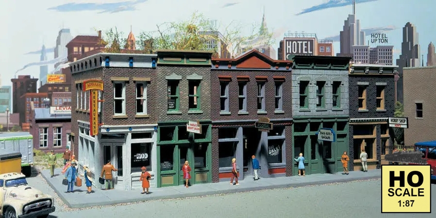 Merchant's Row I -- Kit - 11 x 5 x 4" 27.9 x 12.7 x 10.2cm The easy-to-build Walthers Cornerstone HO Scale Merchant's Row I kit brings together five different stores in one structure at a dynamite price. Often just a few blocks away from the railroad tracks, the business district is one of the most important parts of any small town or big city. This unique kit combines five storefronts into one space-saving structure that fits on almost any HO Scale layout. Add your personal touch to Merchant's Row I with paint and the supplied full-color decals to create a one-of-a-kind model for your steam or diesel-era scene. Merchant's Row I is one of many Cornerstone HO Scale businesses. As shown the kit measures: 11 x 5 x 4" 27.5 x 12.5 x 10cm Five complete stores under one roof Fits 1880s to present Perfect for small town or big city Use with other Cornerstone stores to model a complete business district Colorful decal signs for a variety of businesses Molded in two colors and clear plastic Paints, adhesives, tools, etc not included. Figures, vehicles, scenery, etc not included. |