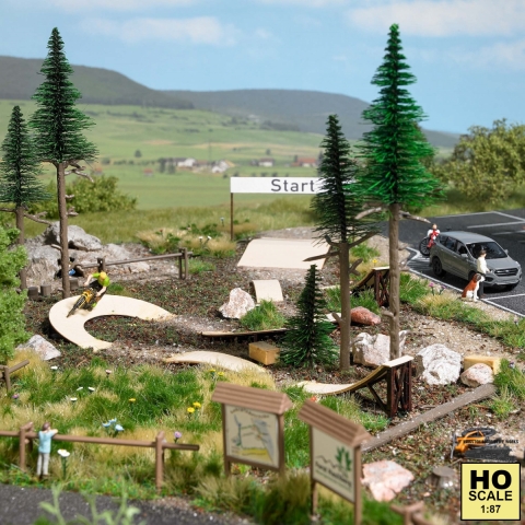 Kit for designing an individual bike trail on flat or hilly terrain. With start/finish signs, 4 wooden trail features and several obstacles. *** Photos may show additional scenery, structures, figures, vehicles, tools, etc which are not included. Please ask before ordering if you're unsure what's included. Most structures are kits which require assembly. *** UPC: 4001738018370