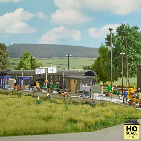 Kit for a platform including ramp for goods and two waiting shelters. Suitable for all train stations. Total dimensions: 495 x 64 mm, 20 mm high. Size of waiting shelter: 21 x 16 mm, 27 mm high *** Photos may show additional scenery, structures, figures, vehicles, tools, etc which are not included. Please ask before ordering if you're unsure what's included. Most structures are kits which require assembly. *** UPC: 4001738019575