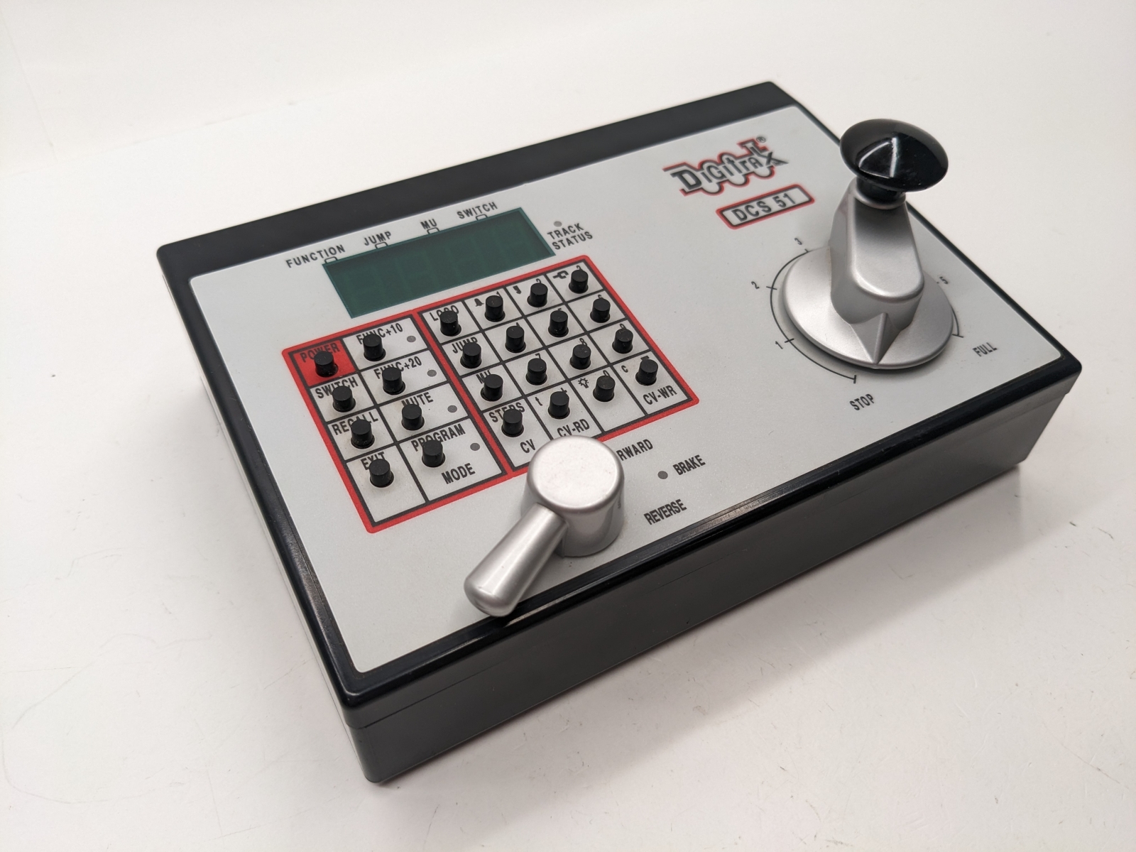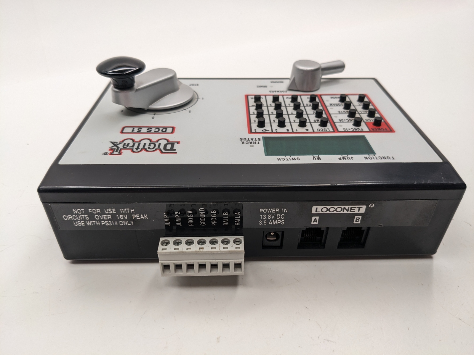DCS51 gives you simple to use Digitrax Complete Train Control for a great price. It offers simplified advanced train operation for any size layout. DCS51 keeps it simple and still has features real model railroaders want. Best of all, the DCS51 is expandable! You won’t have to start over when you want to do more with your railroad. DCS51 Features: Cost effective entry level LocoNet Compatible system Simple intuitive controls for running trains. Large speed control knob and direction switch with brake. Full numeric key pad Large easy to read LED display Easy 2 and 4 digit addressing. Smooth speed control. Run multiple trains at once without blocking! Run up to 20 addresses at the same time on your system. Run up to 20 throttles at the same time on your system. Jump Ports for using DC power packs as additional throttles Use one or two smooth DC power packs as throttles to control DCC equipped locomotives. Simple, cost effective way to add more throttles to your Zephyr Xtra set. Makes it easy to share the fun of DCC with layout visitors and young operators. Functions on locos controlled by Jump throttles remain active. Over 9000 Locomotive Addresses Use Address 00 to run one or more locos without DCC decoders Two Digit Addressing is easy to use. (Address 01-127) Four Digit Addressing-use the number painted on your engines as its address. 3.0 Amps of Power to run multiple trains. Booster outputs 13V DC for safe operation in N and HO scales. Function Control Control for 30 functions (F0Fwd, F0Rev and F1-F28) Function 2 is a special non-latching key that can be used to sound the horn for as long as the key is held down. Constant brightness lighting. Headlights can be directional or independently controlled (depending on decoder). Stationary Decoders, Turnout Control & Turnout Position Reporting Access to stationary decoder control for turnouts and other devices. Control 999 stationary decoder addresses. Consisting Universal consisting, Digitrax preferred method. ALL locos can be consisted, even analog locos. Advanced consisting, allows only advanced consist capable mobile decoders. Basic consisting, program decoders to run on same address. Decoder Programming Built in read/write programmer that can read and write all CVs. Supports Paged programming (Digitrax preferred method). Also supports direct & register mode programming. Operations mode programming can be used to program decoders on the layout. Blast Mode Programming for Sound Expandability with Digitrax LocoNet Use Zephyr Xtra as a starting point for your Digitrax LocoNet System, then add components. Use Zephyr Xtra as an expansion set with Digitrax equipment you already have installed. Add Radio or IR via LocoNet. Just plug in a UR90 or UR91 receiver and add IR and/or Radio throttles. UPC: 652667010474
