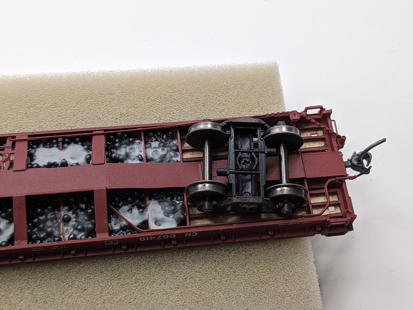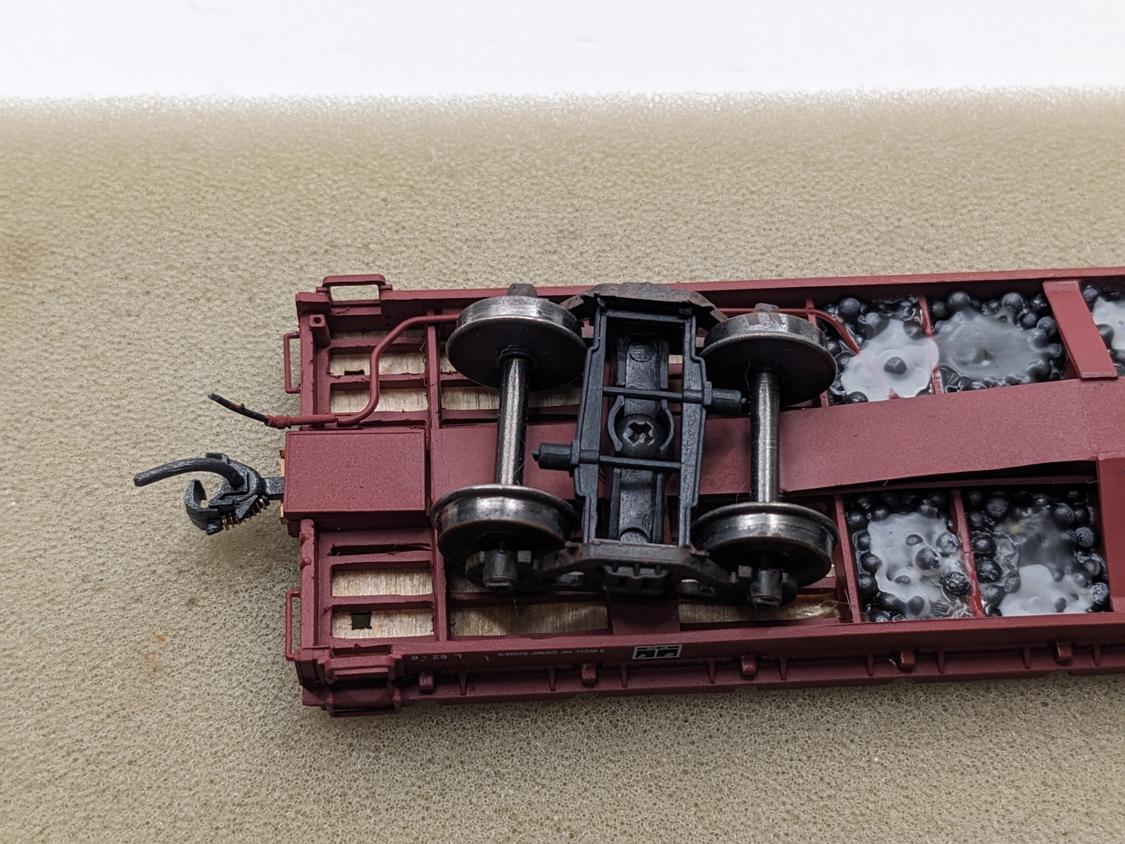 Damage to a couple top corner grab irons, otherwise in good condition. Metal wheels, metal knuckle couplers. Custom lettered. Weight added. Trucks and wheelsets painted. Includes packaging. Description: