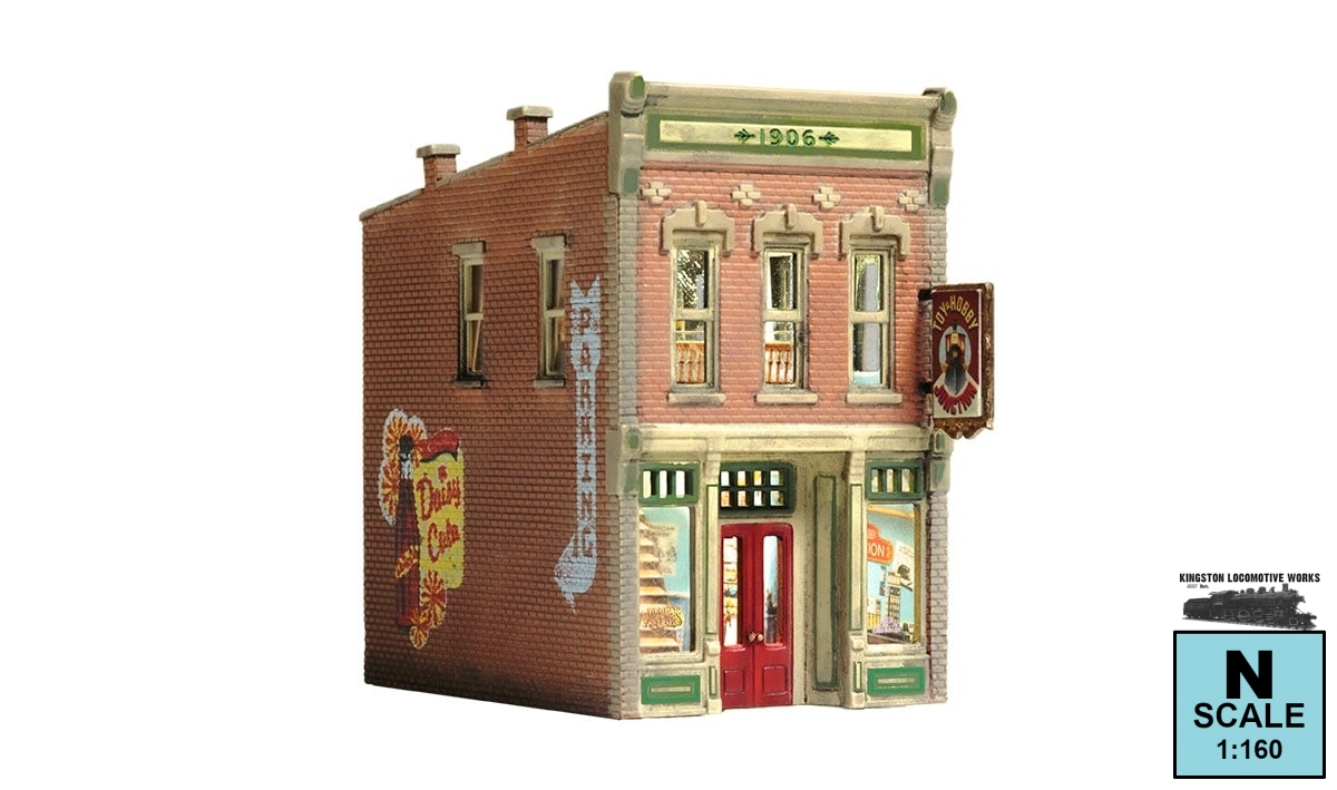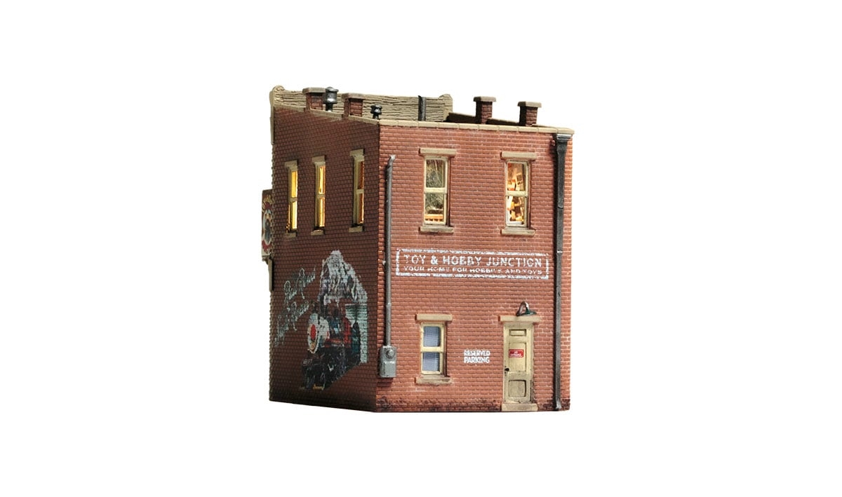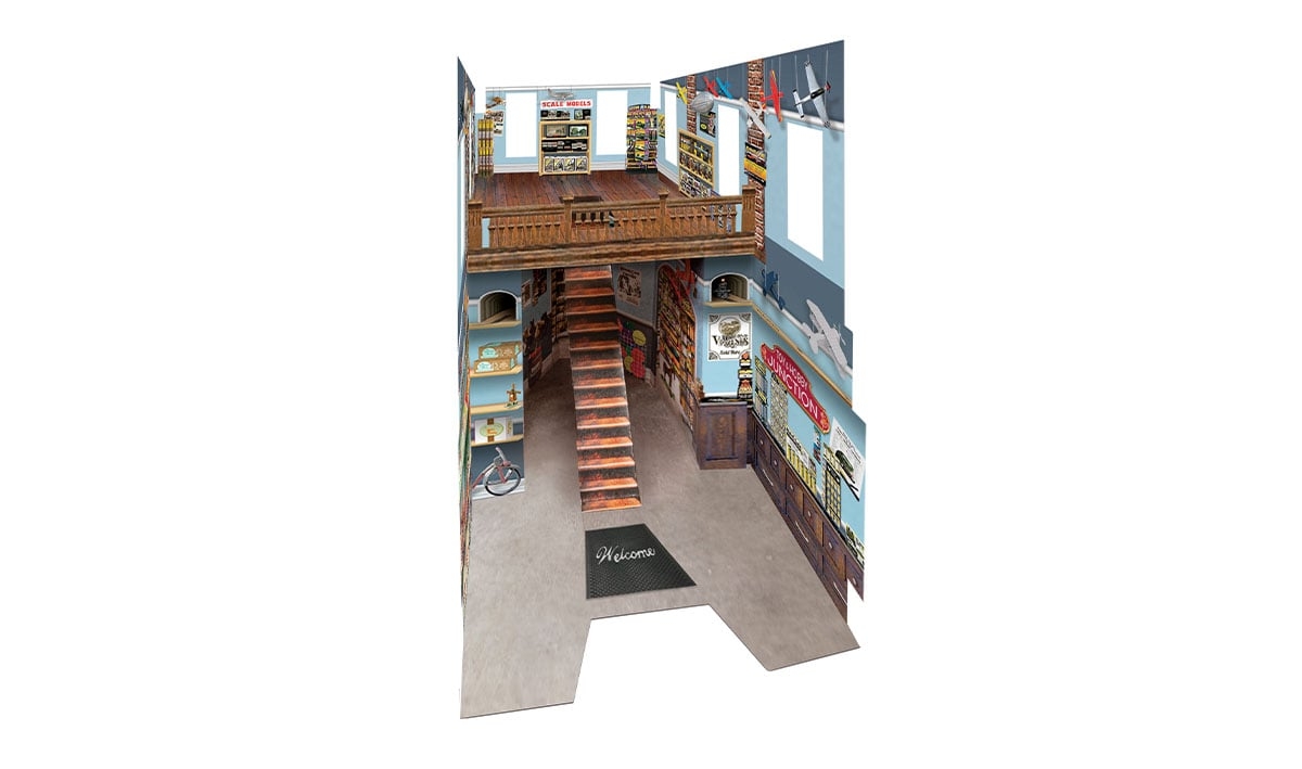 Residents of your layout will want to shop at the classic Toy & Hobby Junction. This mid-20th century era Built-&-Ready® structure features a grand staircase in the center of the two-story building. Showcase the colorful games and hobbies filling the store shelves with LED lights made for use with the Just Plug® Lighting System. View the detailed interior from windows located on every side of the building. This building is hand-painted and authentically weathered. Exterior details include bright red double doors, a train mural and a variety of signage. Toy & Hobby Junction will be available in N, HO and O scales. Note: Suspended Planes only available in HO and O scales. 30mA RoHS Compliant UPC: 724771049593