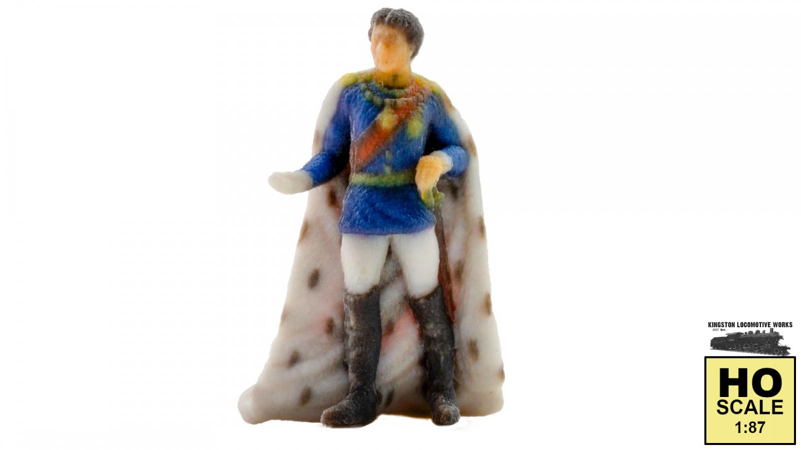King Ludwig II of Bavaria – Majestic figure for historical scenes With the colourful 3D-printed figure “King Ludwig II of Bavaria”, you can bring royal splendour and Bavarian history to your model railway layout or diorama. The detailed miniature shows the fairy-tale king in a blue gala uniform, golden sash, and magnificent white ermine coat with red lining—a perfect highlight for castle layouts, historical displays, and festive scenes. Thanks to state-of-the-art 3D printing technology, all details such as uniform decorations, fabric textures, and color nuances are reproduced with razor-sharp precision – without any post-processing or painting. The figure is ready for immediate use and fits into both realistic and imaginative themed worlds. Optimized for H0 gauge, “King Ludwig II” can be used as a central eye-catcher in a parade, on a castle forecourt, or as part of a historical scene. GTIN/EAN: 4007246108206 Gauge: H0 Scale: 1:87 (H0) Product Notices: 3D color Genus: Human Material: Plastic Position: standing Gender: male Phase of life: Adult *** Photos may show additional scenery, structures, figures, vehicles, tools, etc which are not included. Please ask before ordering if you're unsure what's included. *** Gauge: H0 Scale: 1:87 (H0) Product Notices: 3D color Genus: Human Material: Plastic Position: standing Gender: male Phase of life: Adult UPC: 4007246108206
