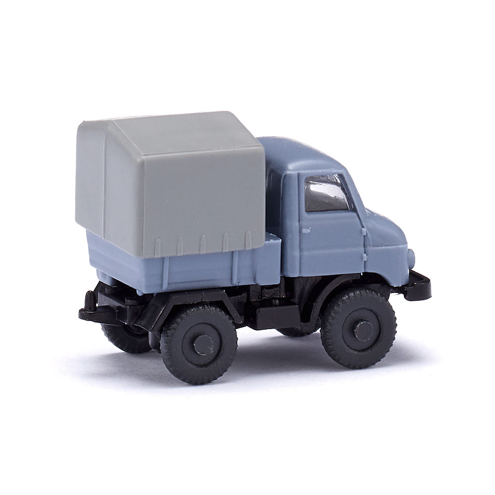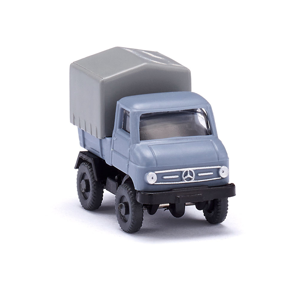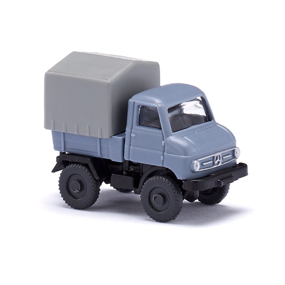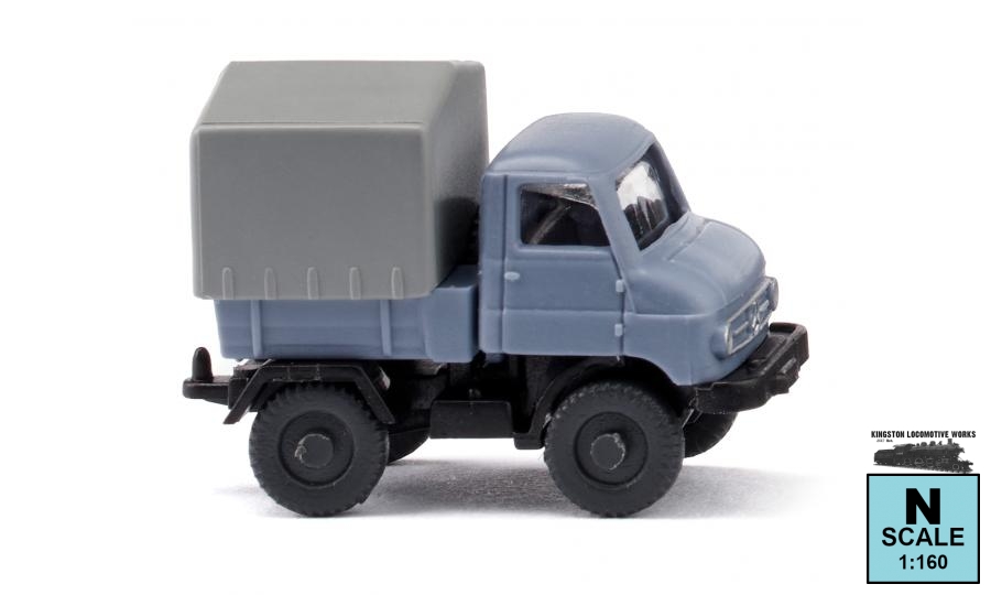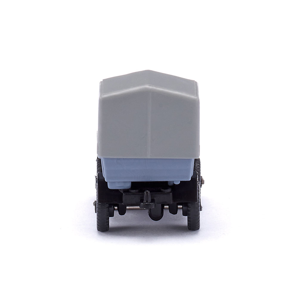 The Unimog U 411 with closed driver’s cab was adopted into the WIKING’s line of 1:87 models early on. This allowed the designers to stay close the original model when they created their N-gauge miniature. Exhibiting the same pleasing proportions as its model sibling, the 1:160 miniature manages to evoke the WIKING charm of decades long gone. Even when compared to its model scale brother, this most recent Unimog manages to convince – the N-gauge selection will feature an epic classic that is sure to endure. Cab and flatbed pigeon blue, interior and chassis wheel black. Attached tarp dust grey. Headlamps with grille ornamental strips and Mercedes-Benz star imprinted silver. UPC: 4006190972055