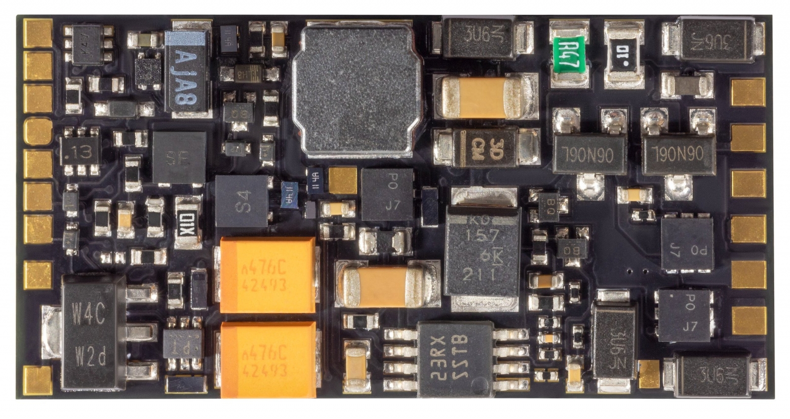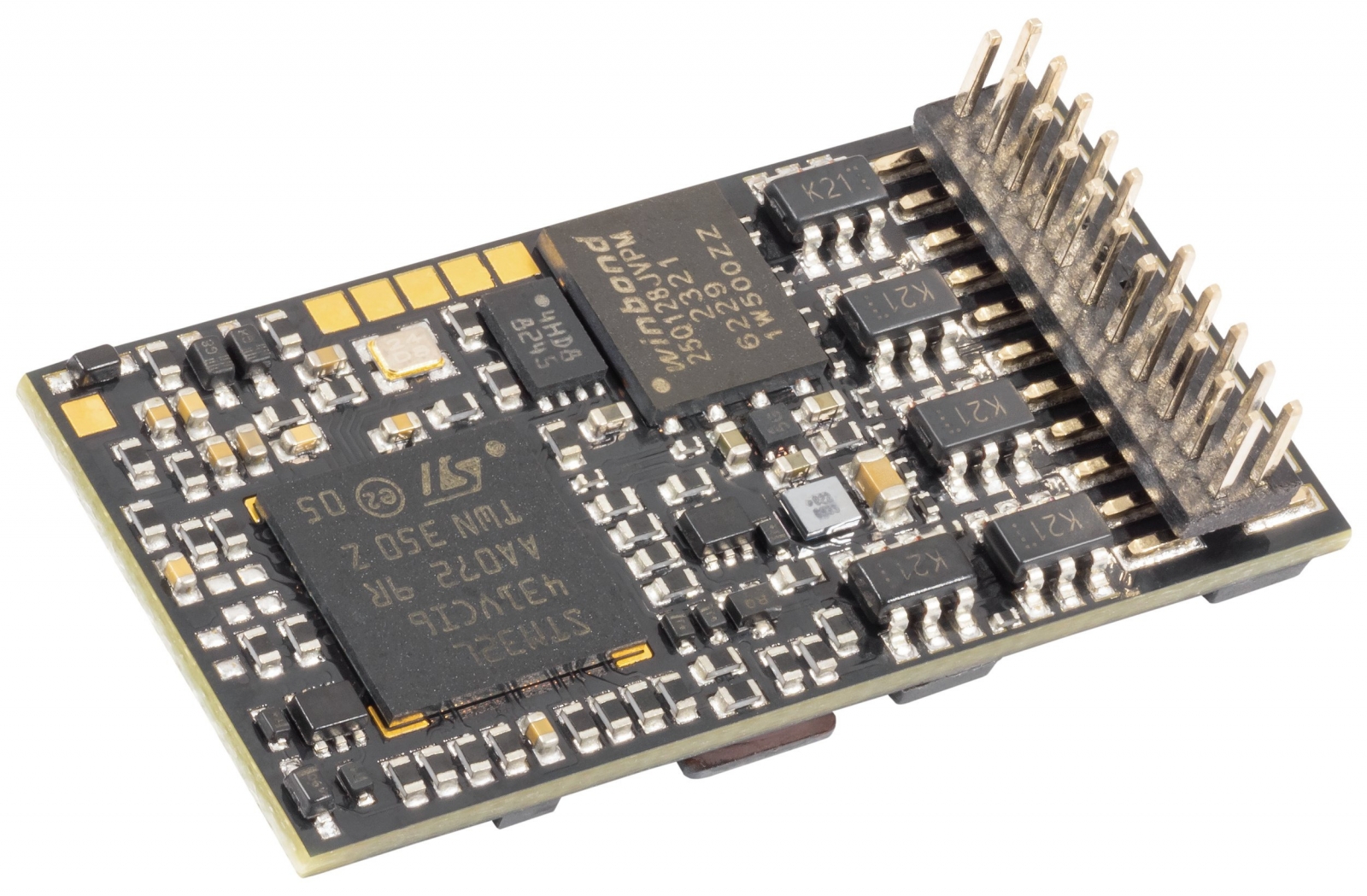 PluX22 Sound decoder - 30 x 15 x 4 mm - 3W Audio 4 Ί - 1,2 A - 10 + 1 FOs Direct connection for stay-alive capacitors 15 V (unlimited capacity) on PluX pin connector UPC: 9009606450227