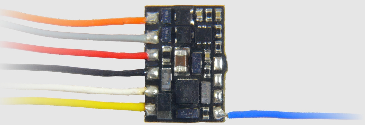 Z scale Subminiature decoder - 8.2 x 5.8 x 2mm - Non sound - 0.5A (1.0A peak) - 4 FOs UPC: 9009606615909
