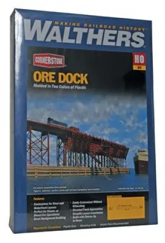 Standing tall on the shores of the Great Lakes, prototypes for the Walthers cornerstone Ore Dock are the centerpiece of any layout. Getting iron ore from the mines to the furnace has always been a huge job. As the furnaces grew, so too did their appetites, requiring loading facilities that were up to the task. Many steel companies and railroads erected huge loading docks at Great Lakes ports to keep the iron ore (and later taconite) moving down to the inland steel mills. Often stretching for hundreds of feet, these engineering masterpieces were first made of wood and later of concrete and steel. Through a series of pockets lining the sides, iron ore could be loaded by gravity into the waiting holds of the big ore boats. Still in use today, ore docks are home to some of the most fascinating railroading in the world. And with this superb kit, it's easy to make it part of your model railroad as well. Carefully engineered to look right without being overwhelming, the basic kit builds into a two-track, single-sided dock. But the modular design offers compete flexibility without the need for cutting and kitbashing. Just combine kits as desired to make a wider, longer, customized dock to fit your space. Ideal for installation along a wall or as a scenic view block, the Ore Dock kit features loads of detailed parts, along with elevated approaches, all molded in color. Each kit has parts for two-tracks on top and is designed so you can combine kits to fit the space on your layout. Approaches can be combined with Cornerstone Engineered Bridge System components for easy integration into your layout. The chutes are positionable and can be built up or down. Complete instructions and decal signs are also included. The Ore Dock is just one of a wide variety of Cornerstone industrial structures. Finished model as shown measures: 48-1/2 x 5 x 10" 123.1 x 12.5 x 25cm. Centerpiece for steel and waterfront layouts Perfect for steam or diesel-era operations Great background building Easily customized or combined with other Ore Dock kits without kitbashing Elevated track approaches simplify layout installation Build with chutes up or down Molded in two appropriate colors Paints, adhesives, tools, etc not included. Figures, vehicles, scenery, etc not included. |