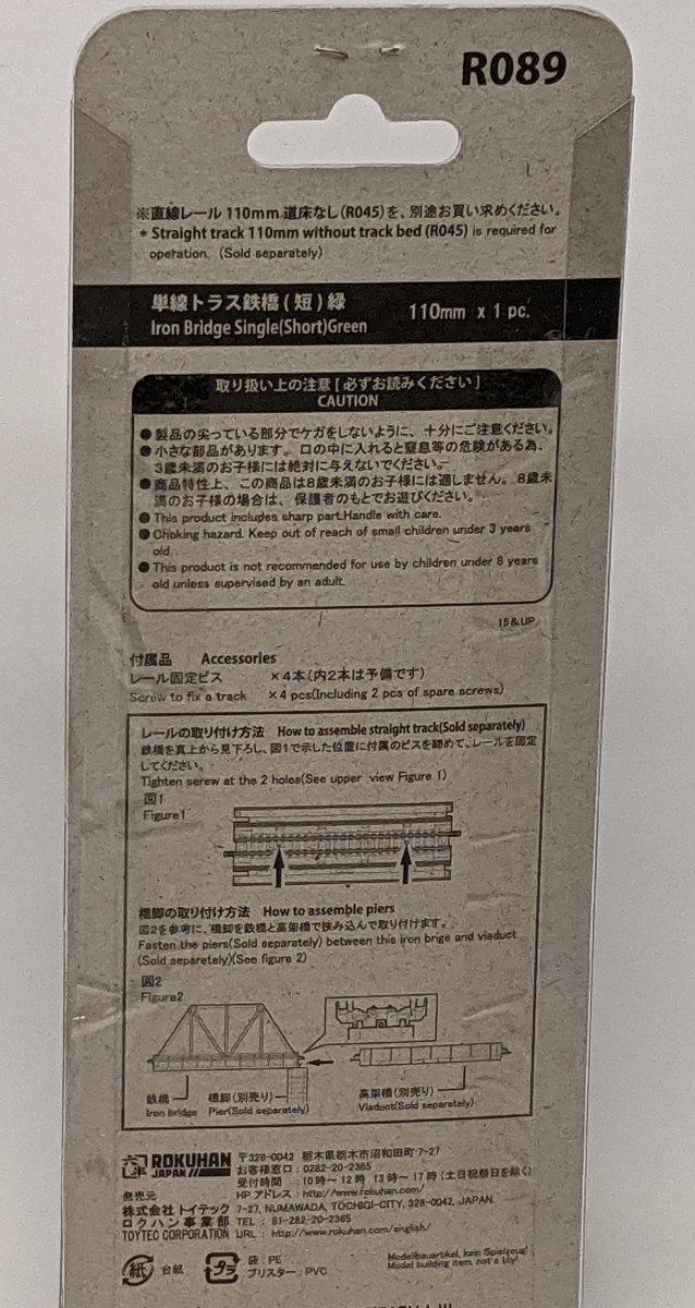 Bridge only, no track. R045 Straight track 110mm without track bed suits this iron bridge. R001 Straight track 110mm with track bed also can be set. UPC: 4571324594583