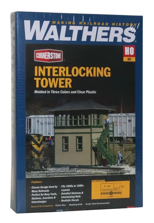 The Walthers Cornerstone HO Scale Interlocking Tower kit is based on one of the most important buildings alongside any railroad. Interlocking towers controlled signals and switches at sidings, junctions, drawbridges, yards and station terminals. In use from the early 1900s until computers took over in the 1980s, a few are still standing. A great starting point for a trackside scene, this model is complete with an exterior stairway, as well as simulated rods for the control system. It has the look and feel of similar structures used along railroads large and small. Several can be used along your line to capture the "family" look so common to railroad architecture. Plastic parts are molded in color and detailed to simulate wood construction. Decal signs and complete instructions are also included. The Interlocking Tower kit is one of a wide variety of Cornerstone HO Scale railroad structures. Great for steam or diesel-era layouts Realistic wood siding and shingled roof Typical of towers used across the continent Molded in colors plus clear window glazing Includes decals Finished structure measures: 5 x 1-7/8 x 4" 12.5 x 4.6 x 10cm. Interlocking rods measure: 5-5/8" 14.2cm long Requires basic assembly, shown with optional painting and weathering. Paints, adhesives, tools, etc not included. Figures, vehicles, trains, scenery, etc pictured not included. |